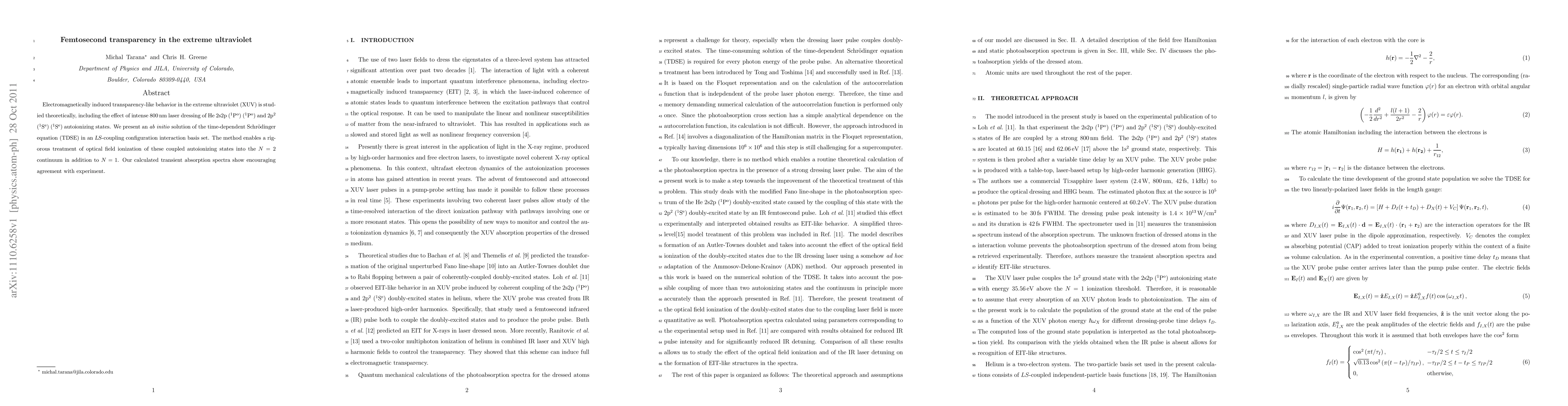 Electromagnetically induced transparency-like behavior in the extreme ultraviolet (XUV) is studied theoretically, including the effect of intense 800 nm laser dressing of He 2s2p (1Po) and 2p^2 (1Se) autoionizing states. We present an ab initio solution of the time-dependent Schrodinger equation (TDSE) in an LS-coupling configuration interaction basis set. The method enables a rigorous treatment of optical field ionization of these coupled autoionizing states into the N = 2 continuum in addition to N = 1. Our calculated transient absorption spectra show encouraging agreement with experiment.