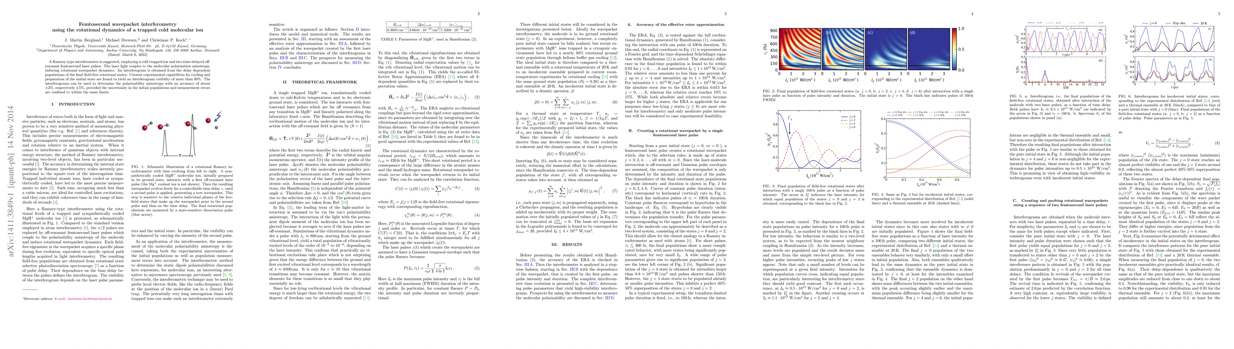 This paper proposes a Ramsey-type interferometer using cold trapped molecular ions and femtosecond laser pulses to study rotational wavepacket dynamics. The interferogram visibility exceeds 80%, enabling the determination of polarizability anisotropy with an accuracy of ±2% to ±5%.