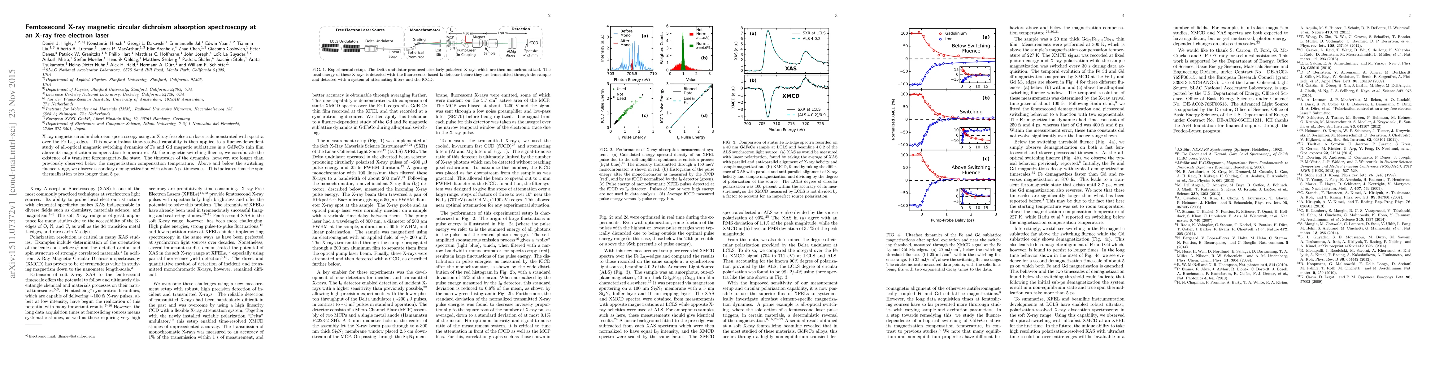 This paper demonstrates femtosecond X-ray magnetic circular dichroism spectroscopy using an X-ray free electron laser, applying it to study the all-optical magnetic switching dynamics in a GdFeCo thin film. It finds that above the magnetization compensation temperature, spin thermalization takes longer than 5 ps, with secondary demagnetization occurring within this timescale.