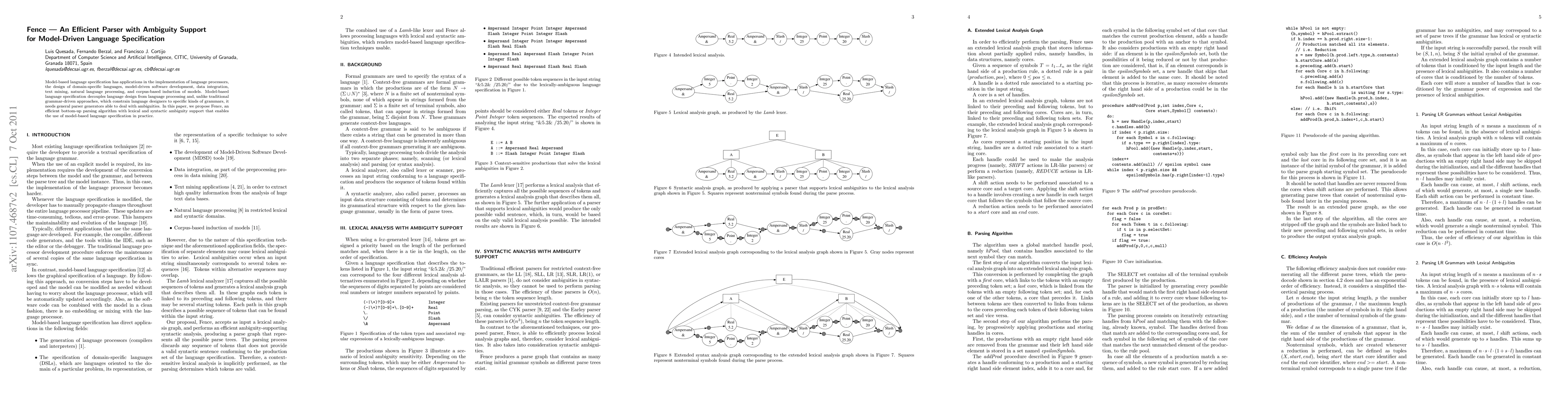 Fence is an efficient bottom-up parsing algorithm designed to support lexical and syntactic ambiguities, facilitating practical use of model-based language specifications in various applications like software development and natural language processing. The algorithm aims to decouple language design from processing, offering flexibility over traditional grammar-driven approaches.