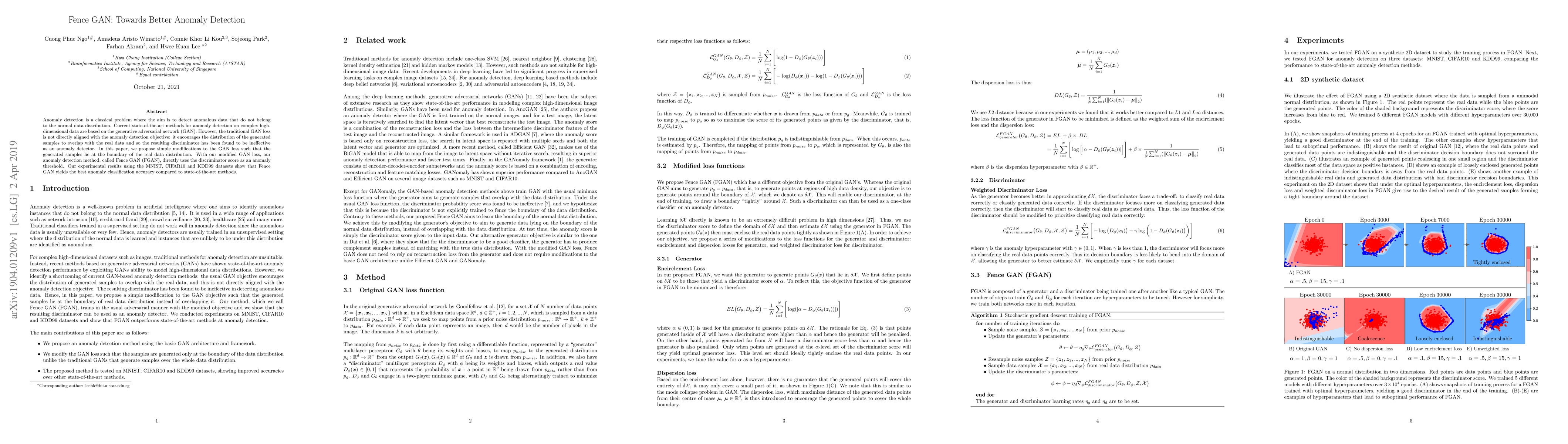 This paper proposes Fence GAN (FGAN) to improve anomaly detection by modifying the GAN loss to position generated samples at the boundary of the real data distribution, making the discriminator more effective as an anomaly detector. Experimental results show FGAN achieves superior anomaly classification accuracy on MNIST, CIFAR10, and KDD99 datasets compared to existing methods.