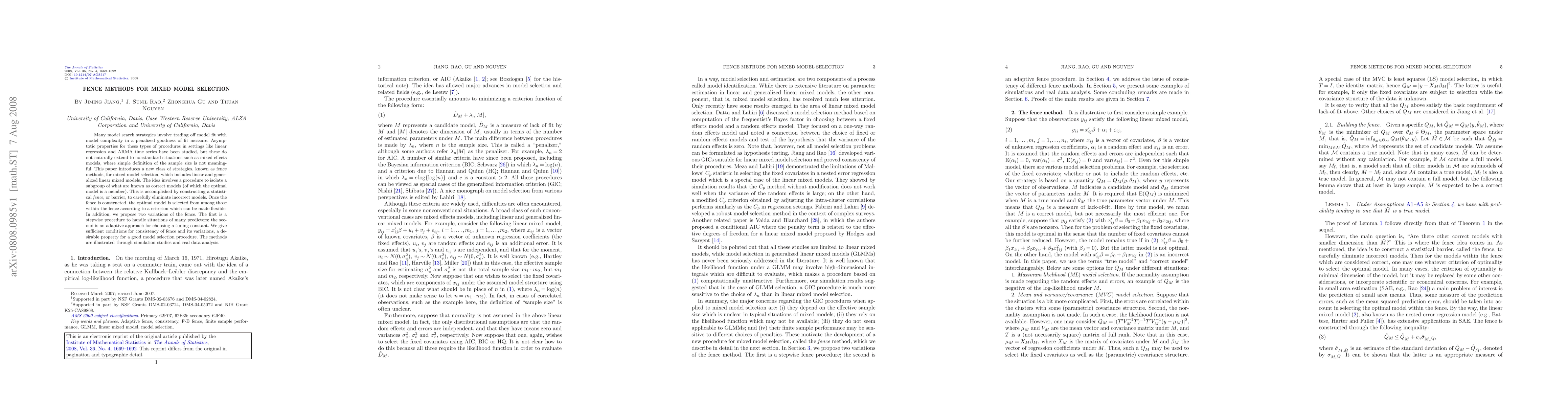 This paper introduces fence methods for selecting optimal mixed models, including linear and generalized linear mixed models, by constructing a statistical fence to eliminate incorrect models and selecting the optimal model from the remaining subgroup. It also proposes variations of the method and demonstrates their consistency through simulations and real data analysis.
