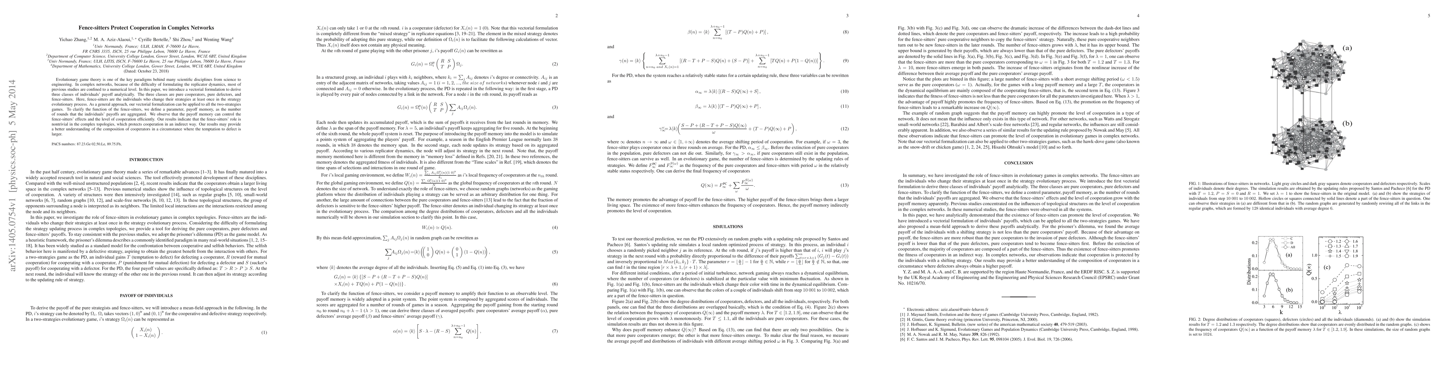 Evolutionary game theory is one of the key paradigms behind many scientific disciplines from science to engineering. In complex networks, because of the difficulty of formulating the replicator dynamics, most of previous studies are confined to a numerical level. In this paper, we introduce a vectorial formulation to derive three classes of individuals' payoff analytically. The three classes are pure cooperators, pure defectors, and fence-sitters. Here, fence-sitters are the individuals who change their strategies at least once in the strategy evolutionary process. As a general approach, our vectorial formalization can be applied to all the two-strategies games. To clarify the function of the fence-sitters, we define a parameter, payoff memory, as the number of rounds that the individuals' payoffs are aggregated. We observe that the payoff memory can control the fence-sitters' effects and the level of cooperation efficiently. Our results indicate that the fence-sitters' role is nontrivial in the complex topologies, which protects cooperation in an indirect way. Our results may provide a better understanding of the composition of cooperators in a circumstance where the temptation to defect is larger.