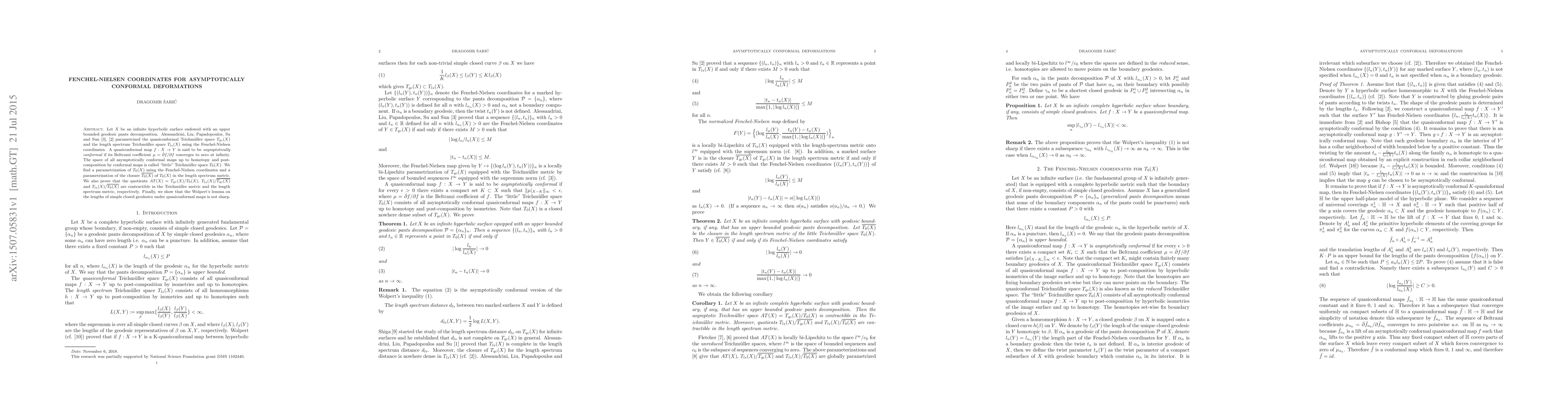 Let $X$ be an infinite hyperbolic surface endowed with an upper bounded geodesic pants decomposition. Alessandrini, Liu, Papadopoulos, Su and Sun \cite{ALPSS}, \cite{ALPS} parametrized the quasiconformal Teichm\"uller space $T_{qc}(X)$ and the length spectrum Teichm\"uller space $T_{ls}(X)$ using the Fenchel-Nielsen coordinates. A quasiconformal map $f:X\to Y$ is said to be {\it asymptotically conformal} if its Beltrami coefficient $\mu =\bar{\partial}f/\partial f$ converges to zero at infinity. The space of all asymptotically conformal maps up to homotopy and post-composition by conformal maps is called "little" Teichm\"uller space $T_0(X)$. We find a parametrization of $T_0(X)$ using the Fenchel-Nielsen coordinates and a parametrization of the closure $\overline{T_0(X)}$ of $T_0(X)$ in the length spectrum metric. We also prove that the quotients $AT(X)=T_{qc}(X)/T_0(X)$, $T_{ls}(X)/\overline{T_{qc}(X)}$ and $T_{ls}(X)/\overline{T_0(X)}$ are contractible in the Teichm\"uller metric and the length spectrum metric, respectively. Finally, we show that the Wolpert's lemma on the lengths of simple closed geodesics under quasiconformal maps is not sharp.