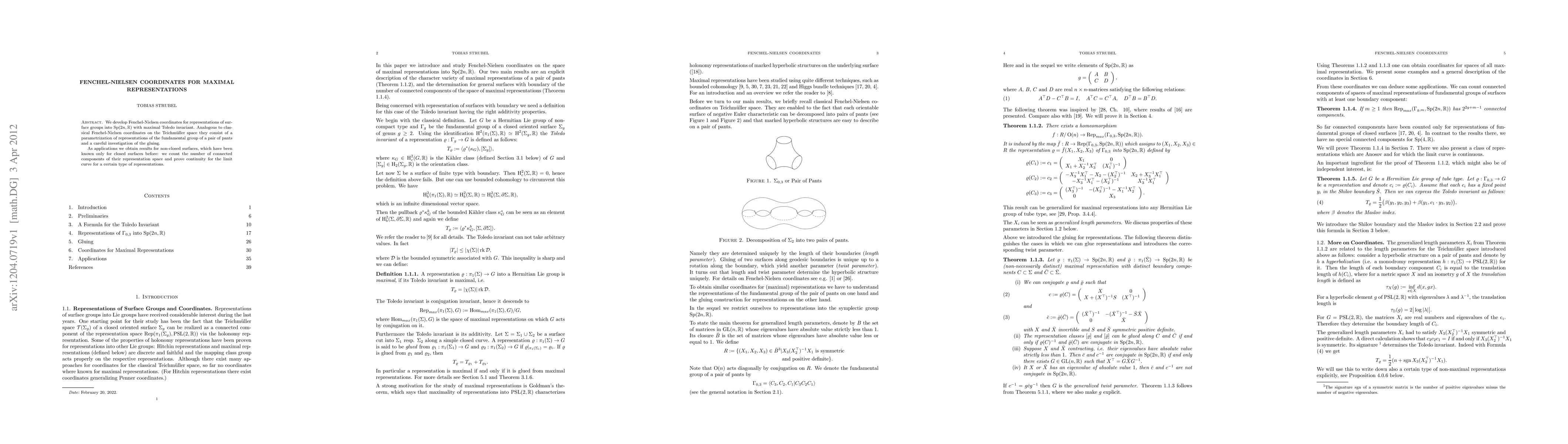 This paper introduces Fenchel-Nielsen coordinates for maximal representations of surface groups in Sp(2n,R), extending classical coordinates used in Teichmüller space. The authors also count the connected components of representation spaces for non-closed surfaces and prove continuity for limit curves in these representations.