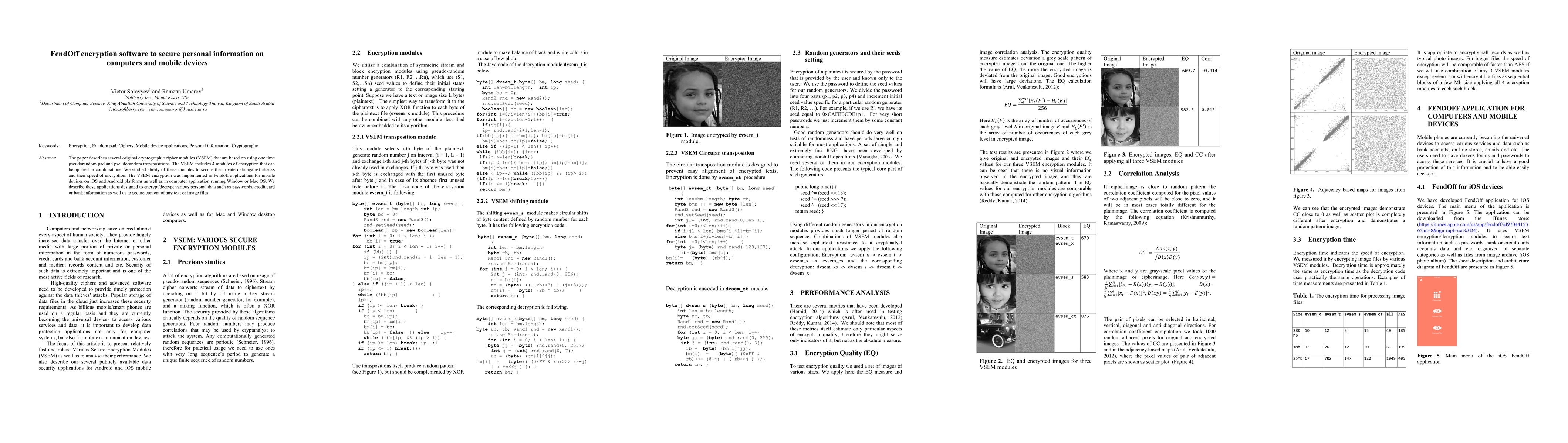 The paper introduces VSEM, a set of four cryptographic cipher modules based on one-time pads and pseudorandom transpositions, designed to secure personal data on various devices. The VSEM modules were implemented in FendOff applications for iOS, Android, Windows, and Mac OS, providing robust encryption for passwords, financial information, and text/image files.