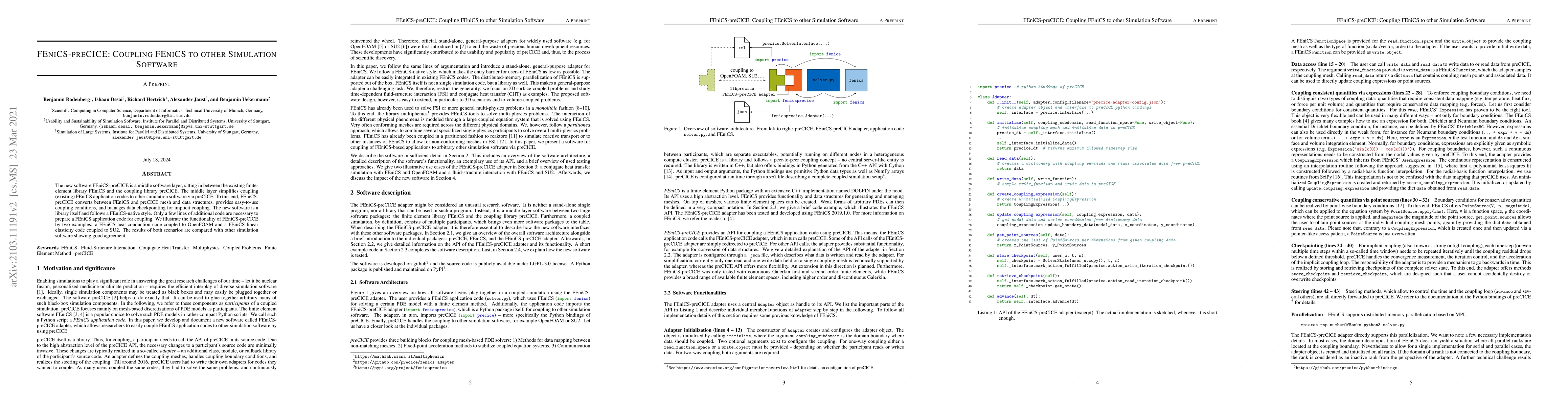 The new software FEniCS-preCICE is a middle software layer, sitting in between the existing finite-element library FEniCS and the coupling library preCICE. The middle layer simplifies coupling (existing) FEniCS application codes to other simulation software via preCICE. To this end, FEniCS-preCICE converts between FEniCS and preCICE mesh and data structures, provides easy-to-use coupling conditions, and manages data checkpointing for implicit coupling. The new software is a library itself and follows a FEniCS-native style. Only a few lines of additional code are necessary to prepare a FEniCS application code for coupling. We illustrate the functionality of FEniCS-preCICE by two examples: a FEniCS heat conduction code coupled to OpenFOAM and a FEniCS linear elasticity code coupled to SU2. The results of both scenarios are compared with other simulation software showing good agreement.