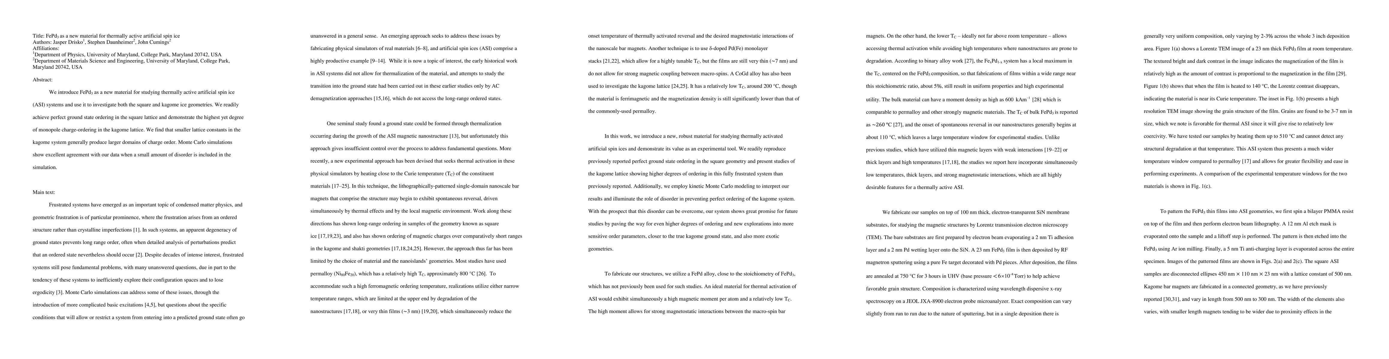 FePd$_{3}$ is introduced as a new material for thermally active artificial spin ice, achieving perfect ground state ordering in square lattices and high monopole charge-ordering in kagome lattices, with smaller lattice constants enhancing charge order domains. Monte Carlo simulations align well with the experimental data when considering minor disorder.