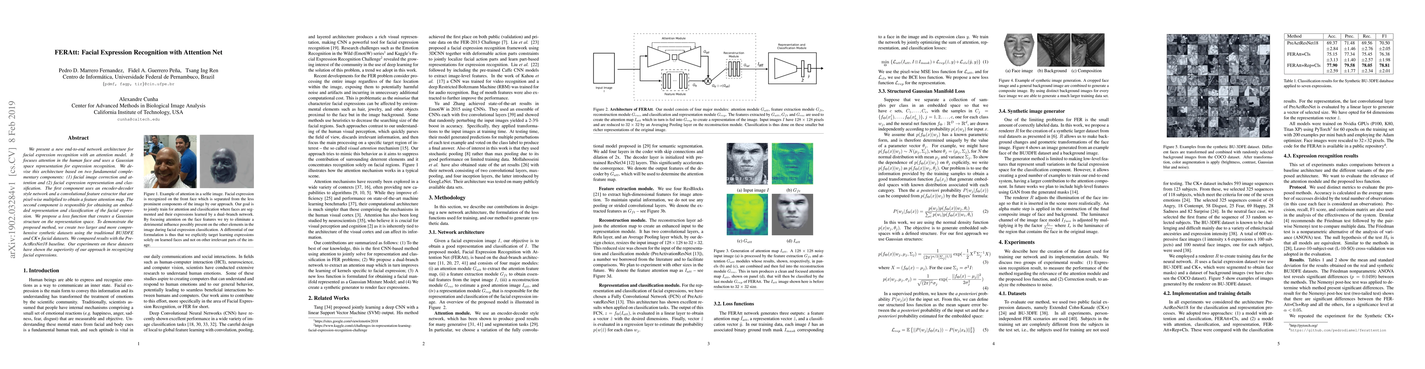 The FERAtt network employs an attention mechanism to enhance facial expression recognition, combining image correction and attention with a Gaussian space representation for superior expression classification compared to a PreActResNet18 baseline. Synthetic datasets were created to validate the method's effectiveness.
