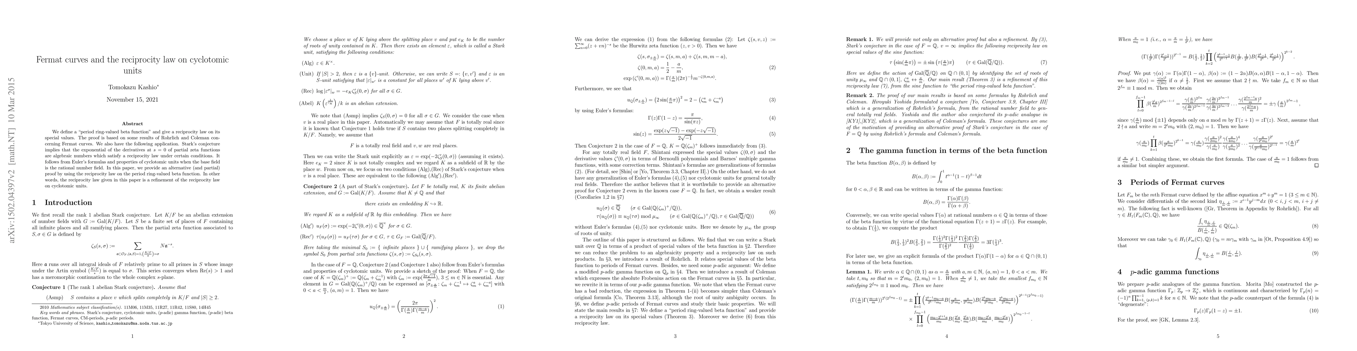 We define a "period ring-valued beta function" and give a reciprocity law on its special values. The proof is based on some results of Rohrlich and Coleman concerning Fermat curves. We also have the following application. Stark's conjecture implies that the exponential of the derivatives at $s=0$ of partial zeta functions are algebraic numbers which satisfy a reciprocity law under certain conditions. It follows from Euler's formulas and properties of cyclotomic units when the base field is the rational number field. In this paper, we provide an alternative (and partial) proof by using the reciprocity law on the period ring-valued beta function. In other words, the reciprocity law given in this paper is a refinement of the reciprocity law on cyclotomic units.