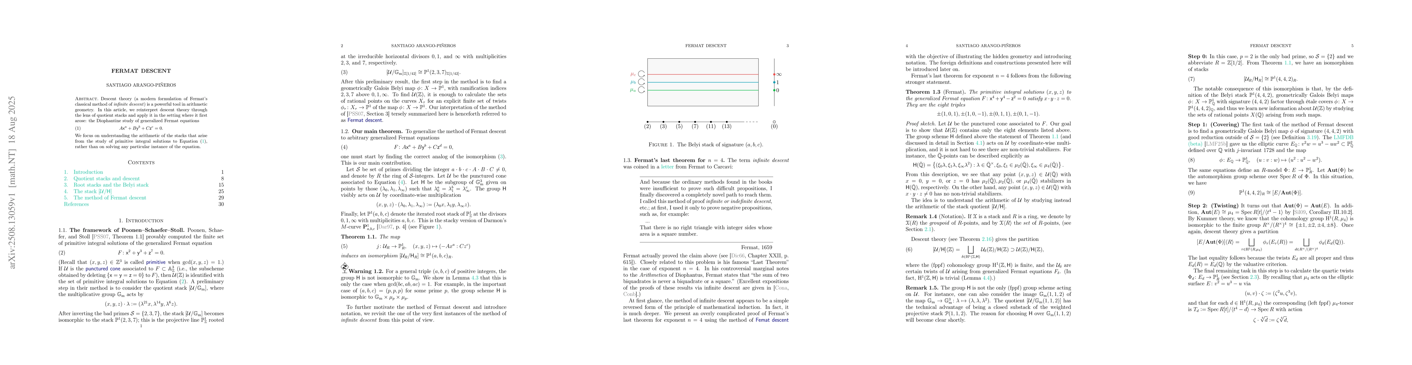 Descent theory (a modern formulation of Fermat's classical method of infinite descent) is a powerful tool in arithmetic geometry. In this article, we reinterpret descent theory through the lens of quotient stacks and apply it in the setting where it first arose: the Diophantine study of generalized Fermat equations (1) \[ Ax^a + By^b + Cz^c = 0. \] We focus on understanding the arithmetic of the stacks that arise from the study of primitive integral solutions to general Fermat equations, rather than on solving any particular instance of the equation.
