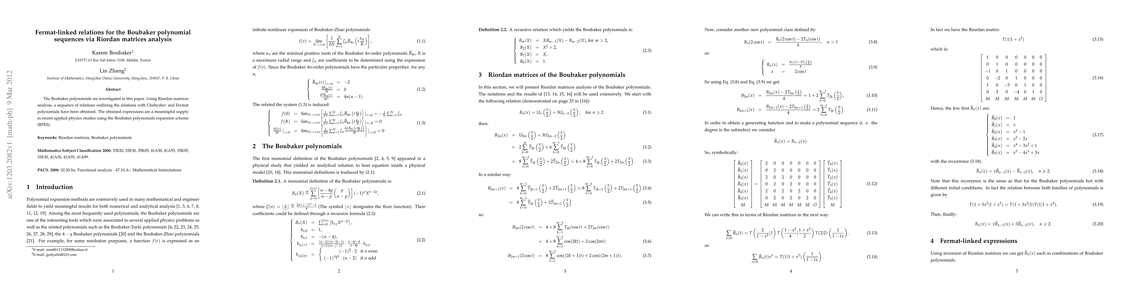 The Boubaker polynomials are investigated in this paper. Using Riordan matrices analysis, a sequence of relations outlining the relations with Chebyshev and Fermat polynomials have been obtained. The obtained expressions are a meaningful supply to recent applied physics studies using the Boubaker polynomials expansion scheme (BPES).