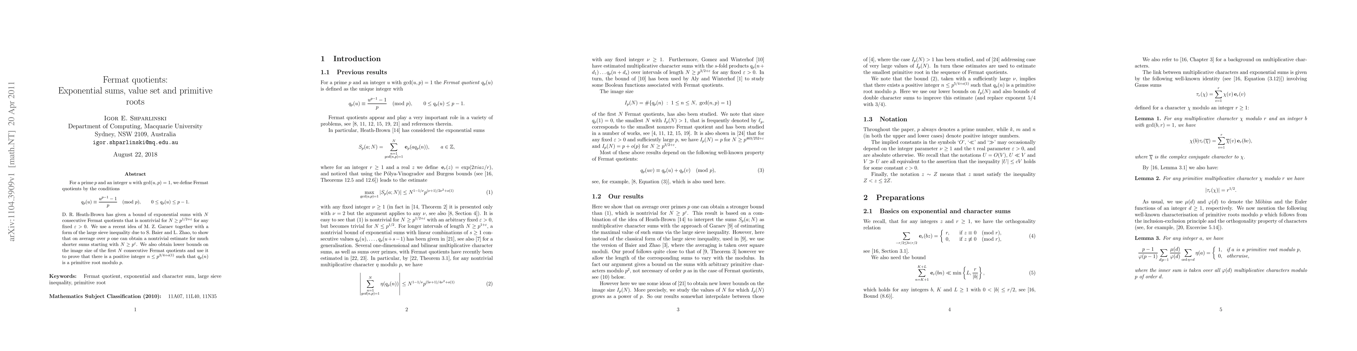 This paper investigates Fermat quotients, establishing nontrivial bounds for exponential sums involving these quotients and proving that there exists a positive integer $n$ with $n \le p^{3/4 + o(1)}$ for which $q_p(n)$ is a primitive root modulo $p$. The research utilizes methods from analytic number theory, including a refined large sieve inequality.