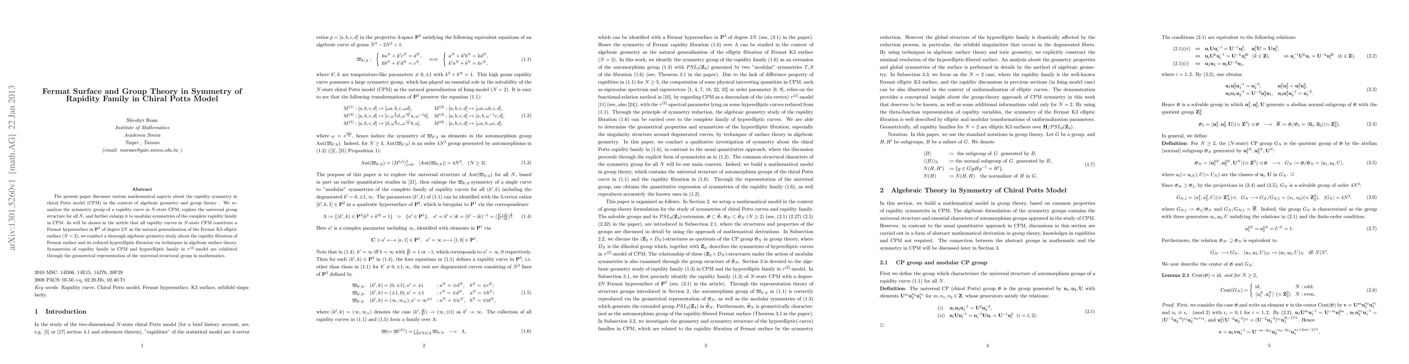 The present paper discusses various mathematical aspects about the rapidity symmetry in chiral Potts model (CPM) in the context of algebraic geometry and group theory . We re-analyze the symmetry group of a rapidity curve in $N$-state CPM, explore the universal group structure for all $N$, and further enlarge it to modular symmetries of the complete rapidity family in CPM. As will be shown in the article that all rapidity curves in $N$-state CPM constitute a Fermat hypersurface in $\PZ^3$ of degree 2N as the natural generalization of the Fermat K3 elliptic surface $(N=2)$, we conduct a thorough algebraic geometry study about the rapidity fibration of Fermat surface and its reduced hyperelliptic fibration via techniques in algebraic surface theory. Symmetries of rapidity family in CPM and hyperelliptic family in $\tau^{(2)}$-model are exhibited through the geometrical representation of the universal structural group in mathematics.
