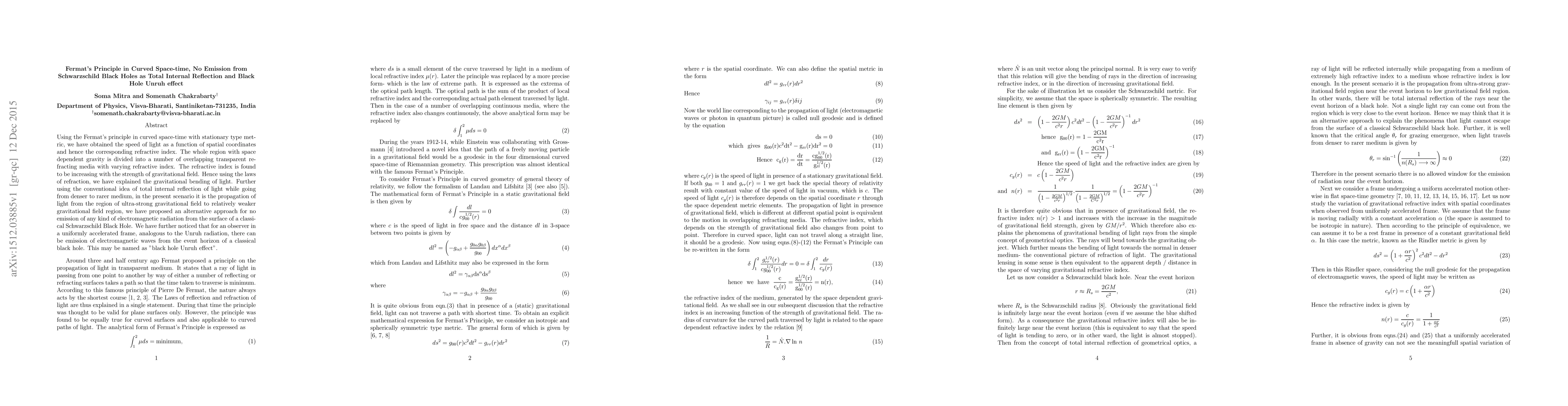 This paper applies Fermat's principle in curved space-time to derive a refractive index that increases with gravitational strength, explaining light bending. It uses total internal reflection to propose no electromagnetic radiation emission from Schwarzschild black holes, and introduces the "black hole Unruh effect" for accelerated observers.
