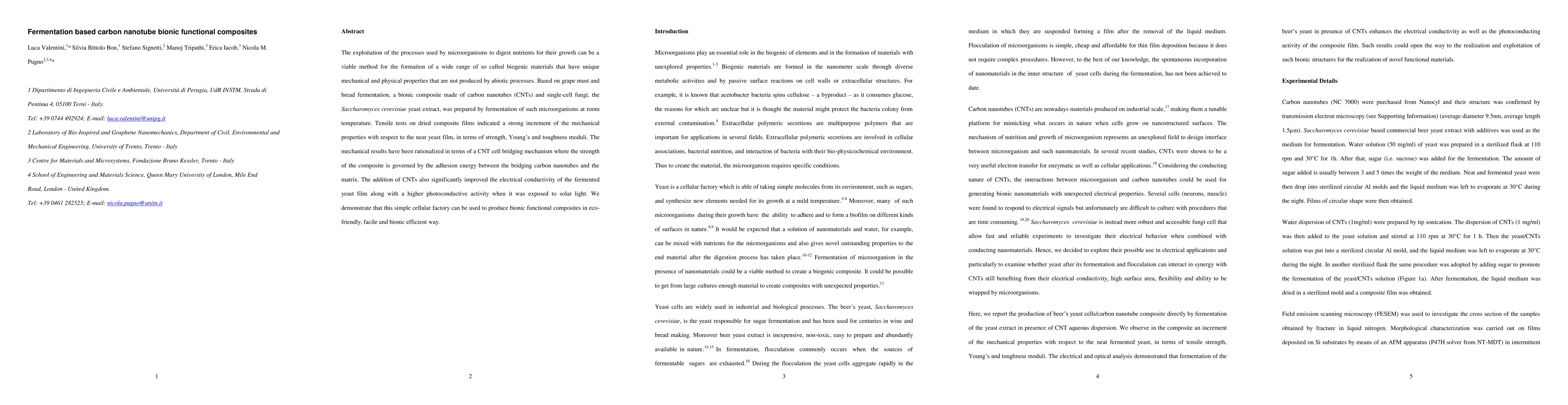 The exploitation of the processes used by microorganisms to digest nutrients for their growth can be a viable method for the formation of a wide range of so called biogenic materials that have unique mechanical and physical properties that are not produced by abiotic processes. Based on grape must and bread fermentation, a bionic composite made of carbon nanotubes (CNTs) and single-cell fungi, the Saccharomyces cerevisiae yeast extract, was prepared by fermentation of such microorganisms at room temperature.