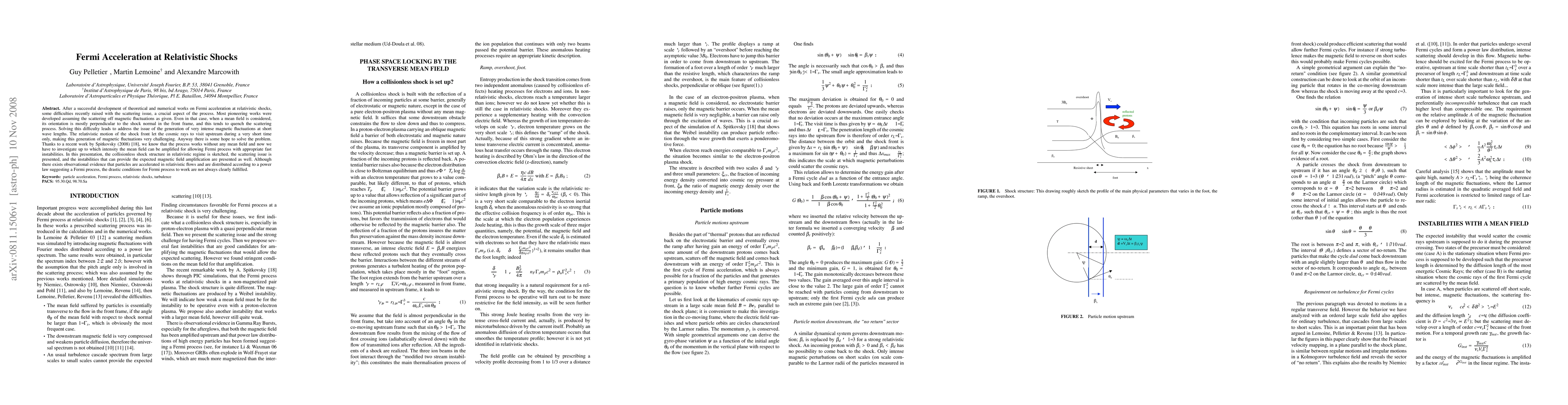 This paper discusses the challenges in Fermi acceleration at relativistic shocks, particularly focusing on the scattering issue and the generation of intense magnetic fluctuations. Recent findings suggest that the process can occur without a mean field, but the amplification of mean fields through fast instabilities remains a critical area for further investigation.