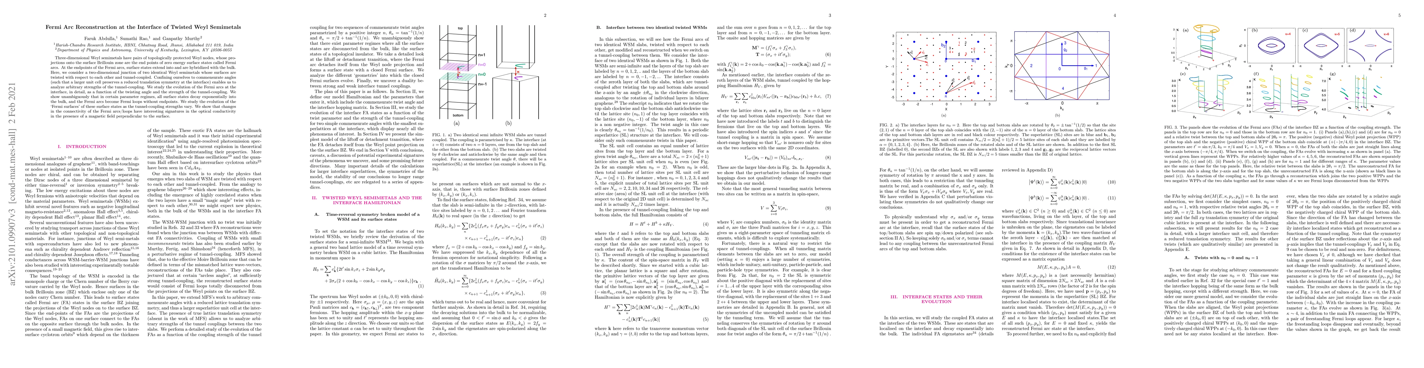 Three-dimensional Weyl semimetals have pairs of topologically protected Weyl nodes, whose projections onto the surface Brillouin zone are the end points of zero energy surface states called Fermi arcs. At the endpoints of the Fermi arcs, surface states extend into and are hybridized with the bulk. Here, we consider a two-dimensional junction of two identical Weyl semimetals whose surfaces are twisted with respect to each other and tunnel-coupled. Confining ourselves to commensurate angles (such that a larger unit cell preserves a reduced translation symmetry at the interface) enables us to analyze arbitrary strengths of the tunnel-coupling. We study the evolution of the Fermi arcs at the interface, in detail, as a function of the twisting angle and the strength of the tunnel-coupling. We show unambiguously that in certain parameter regimes, all surface states decay exponentially into the bulk, and the Fermi arcs become Fermi loops without endpoints. We study the evolution of the `Fermi surfaces' of these surface states as the tunnel-coupling strengths vary. We show that changes in the connectivity of the Fermi arcs/loops have interesting signatures in the optical conductivity in the presence of a magnetic field perpendicular to the surface.