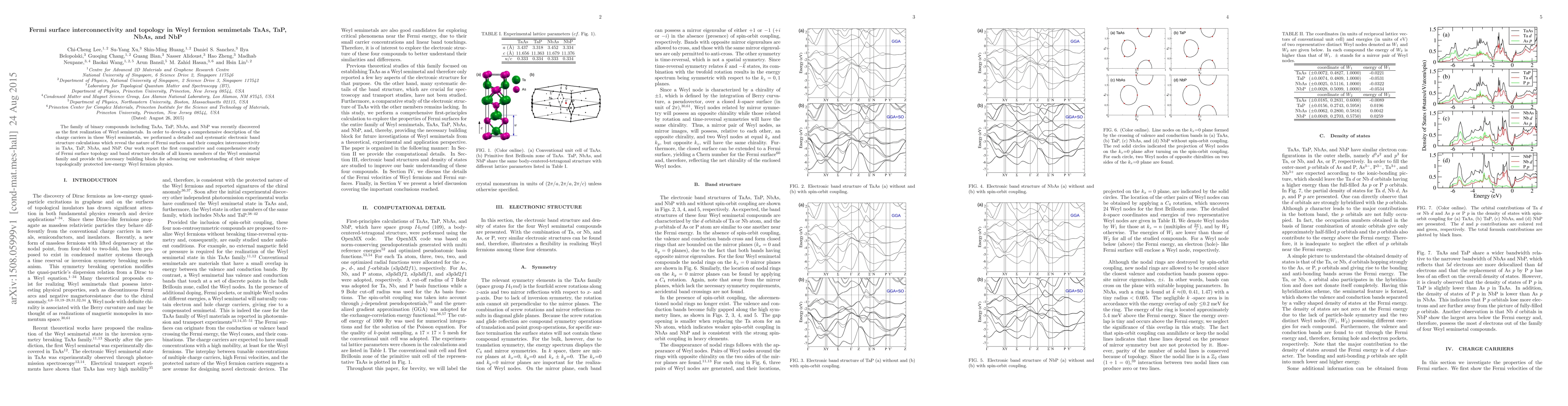 This paper systematically investigates the Fermi surface topology and interconnectivity in TaAs, TaP, NbAs, and NbP—the first discovered Weyl semimetals—through electronic structure calculations. It provides the first comprehensive comparative study of these materials, elucidating their unique topologically protected properties and low-energy Weyl fermion physics.