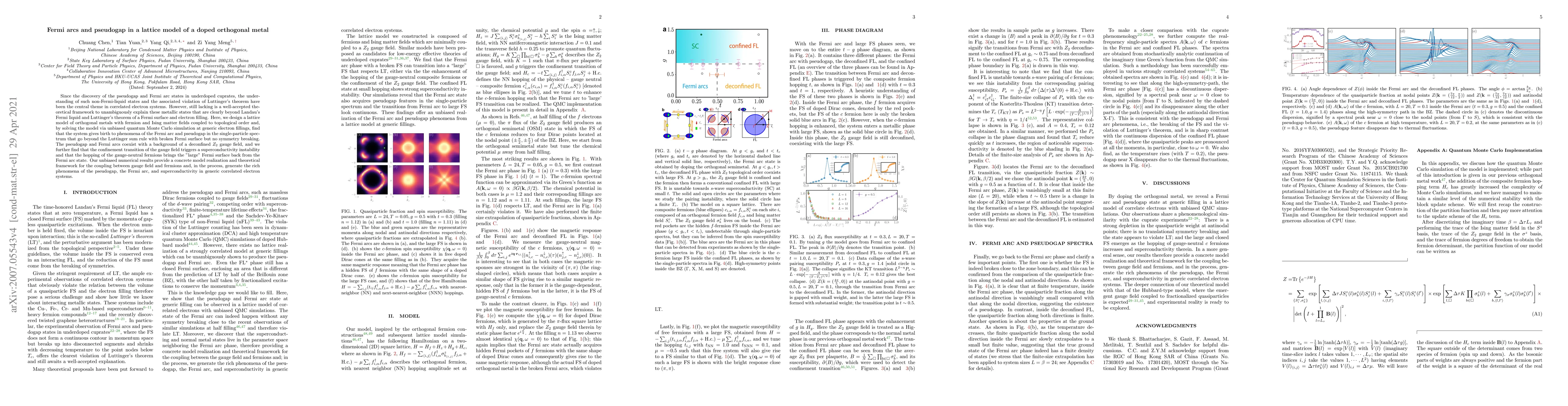 This paper presents a lattice model of doped orthogonal metals that exhibits Fermi arcs and pseudogap phenomena, challenging traditional Luttinger's theorem. The model, solved via quantum Monte Carlo simulations, reveals the coexistence of pseudogap and Fermi arcs with a deconfined Z2 gauge field, and shows how gauge field confinement transitions can induce superconductivity and restore a large Fermi surface.