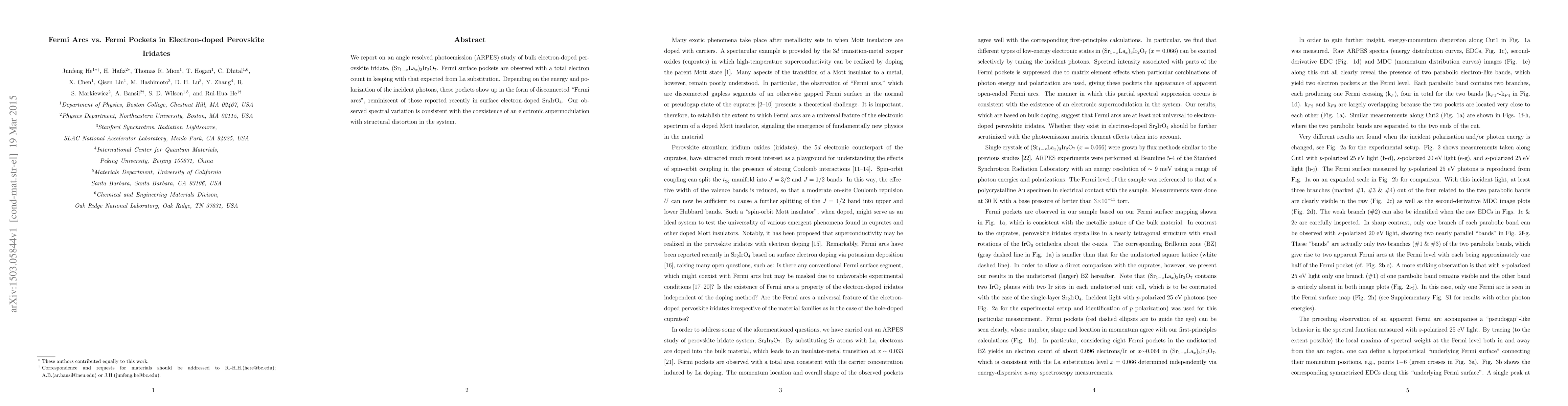 This paper reports on ARPES studies of electron-doped perovskite iridate (Sr1-xLax)3Ir2O7, revealing Fermi surface pockets that appear as disconnected Fermi arcs under varying energy and polarization conditions. The findings suggest coexistence of electronic supermodulation and structural distortion in the material.