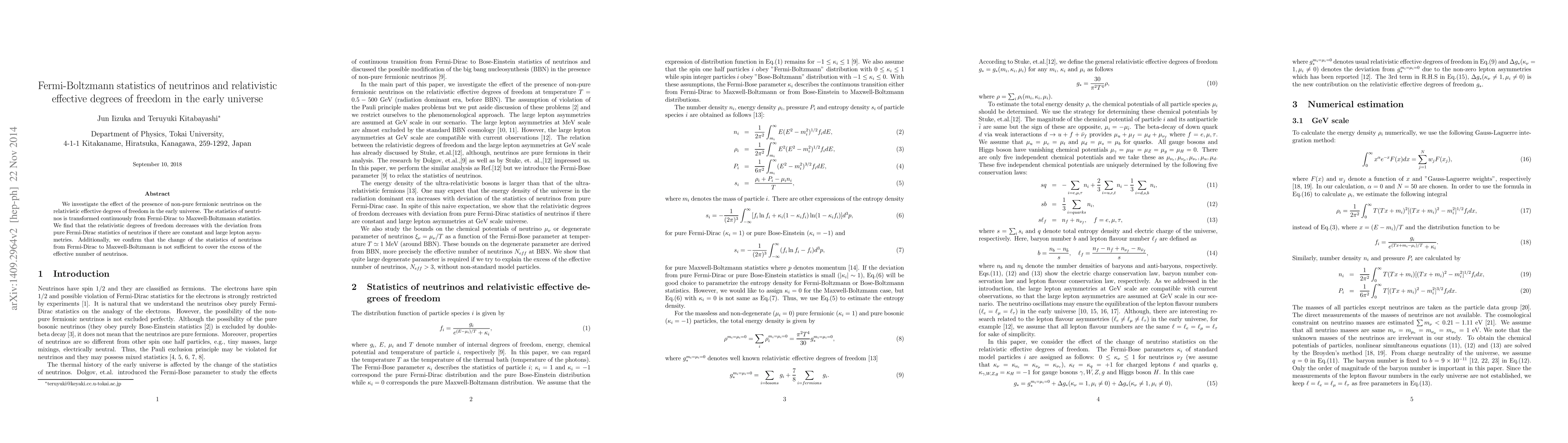 This paper explores how non-pure fermionic neutrinos affect the relativistic effective degrees of freedom in the early universe, finding that deviations from pure Fermi-Dirac statistics lead to a decrease in these degrees of freedom under constant large lepton asymmetries. It concludes that the change in neutrino statistics alone cannot explain the observed excess in the effective number of neutrinos.