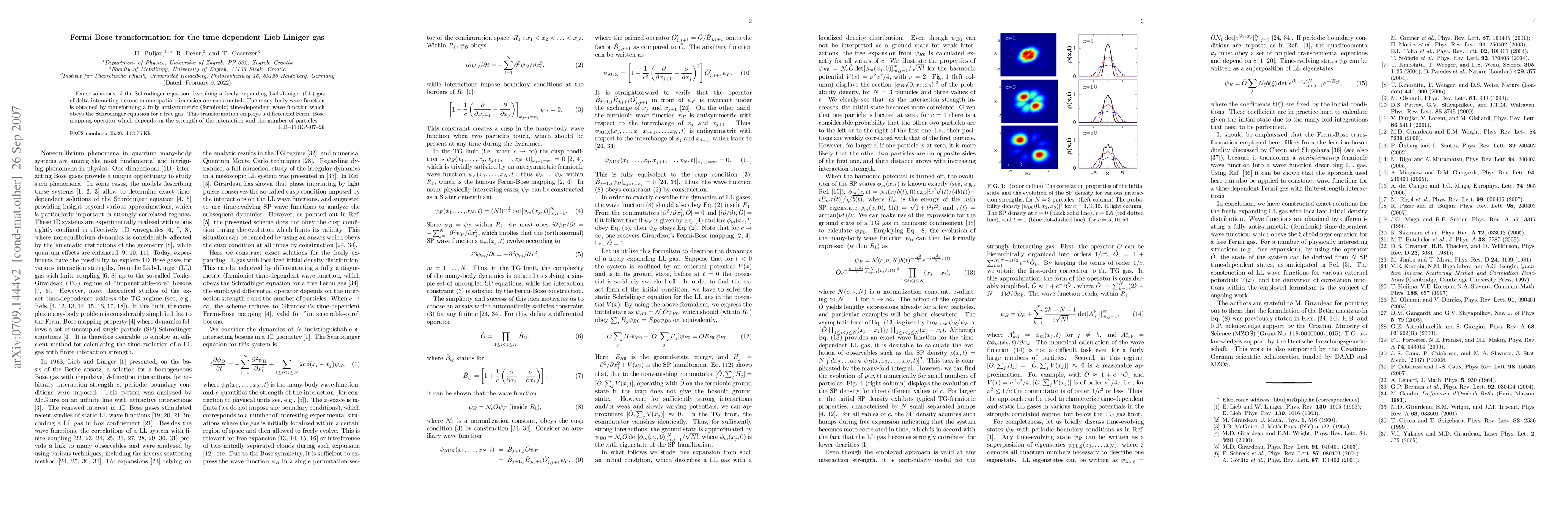 The paper constructs exact solutions for a freely expanding Lieb-Liniger gas of delta-interacting bosons using a Fermi-Bose transformation. The many-body wave function is derived from a fermionic time-dependent wave function via a differential mapping operator that accounts for interaction strength and particle number.