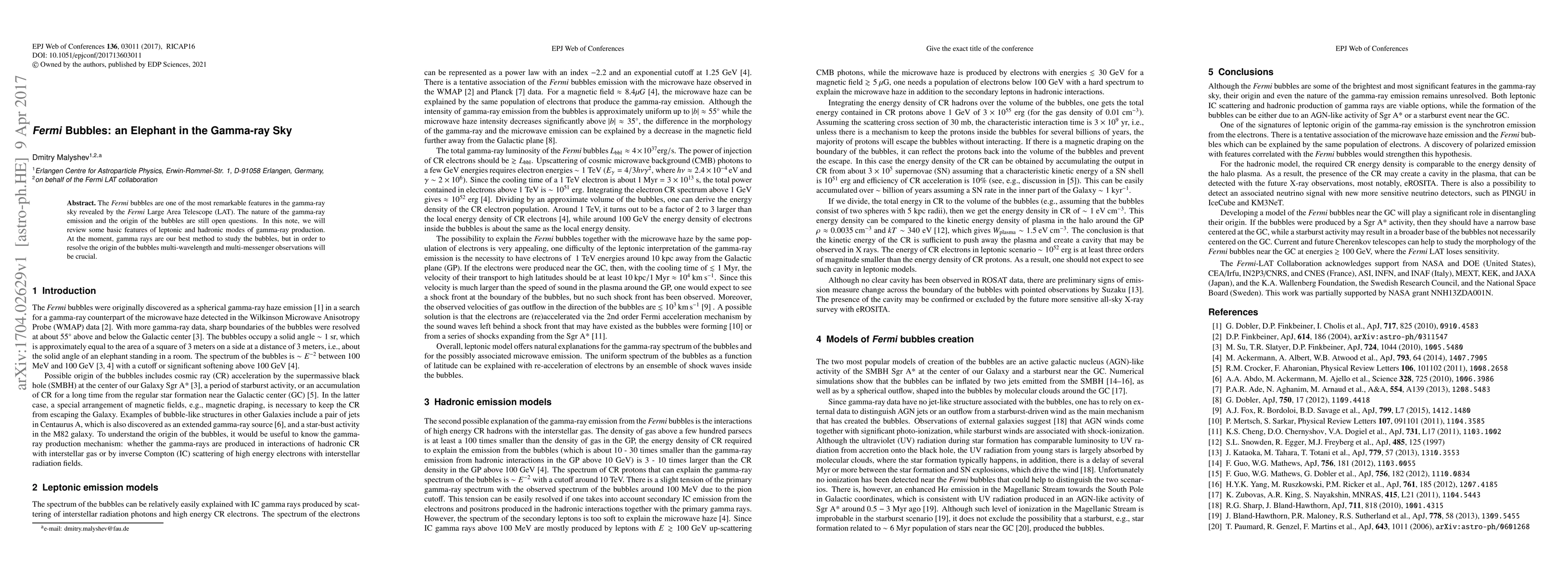 The Fermi bubbles are prominent gamma-ray features in the sky, with their origin and emission mechanisms still unclear. Current understanding focuses on leptonic and hadronic gamma-ray production models, but multi-wavelength and multi-messenger observations are essential to fully resolve their nature.