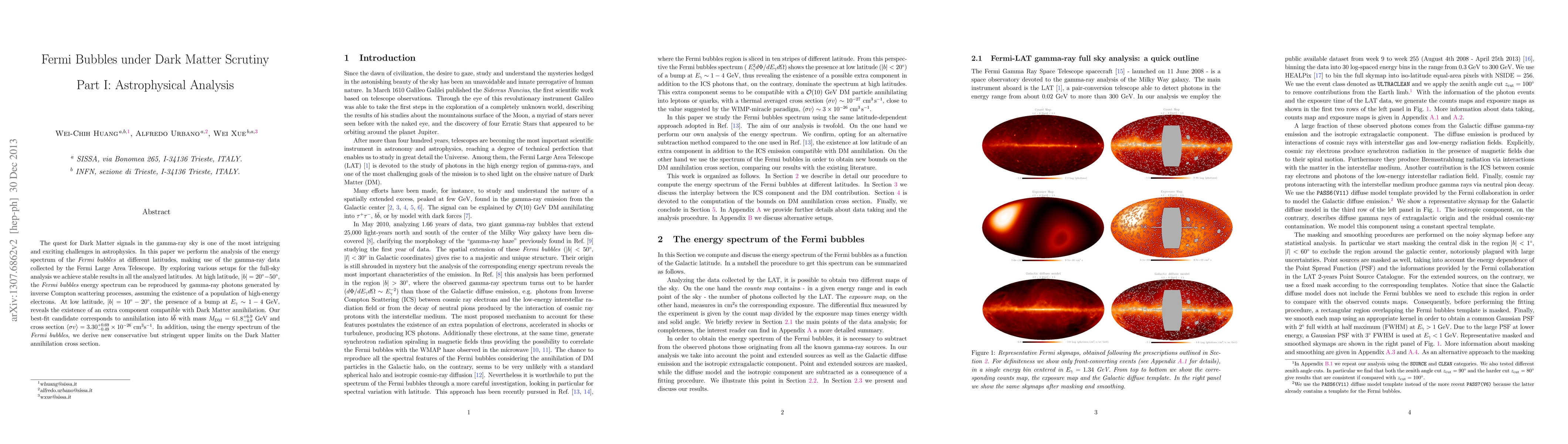 This paper analyzes the gamma-ray spectrum of Fermi bubbles at different latitudes using Fermi Large Area Telescope data, finding evidence for Dark Matter annihilation at low latitudes. The best-fit model suggests Dark Matter particles annihilating into $b\bar{b}$ with a mass of $61.8^{+6.9}_{-4.9}$ GeV and a cross section of $<\sigma v> = 3.30^{+0.69}_{-0.49}\times 10^{-26}$ cm$^{3}$s$^{-1}$.