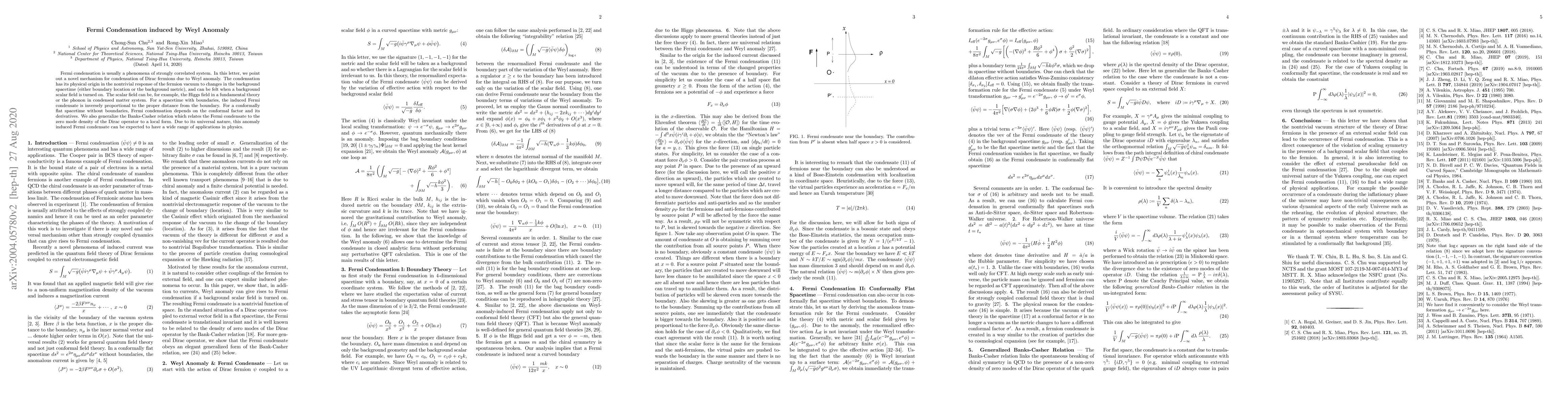 The paper introduces a new mechanism for Fermi condensation via Weyl anomaly and derives explicit expressions for the Fermi condensate near boundaries and in conformally flat spacetimes, along with a generalized Banks-Casher relation.