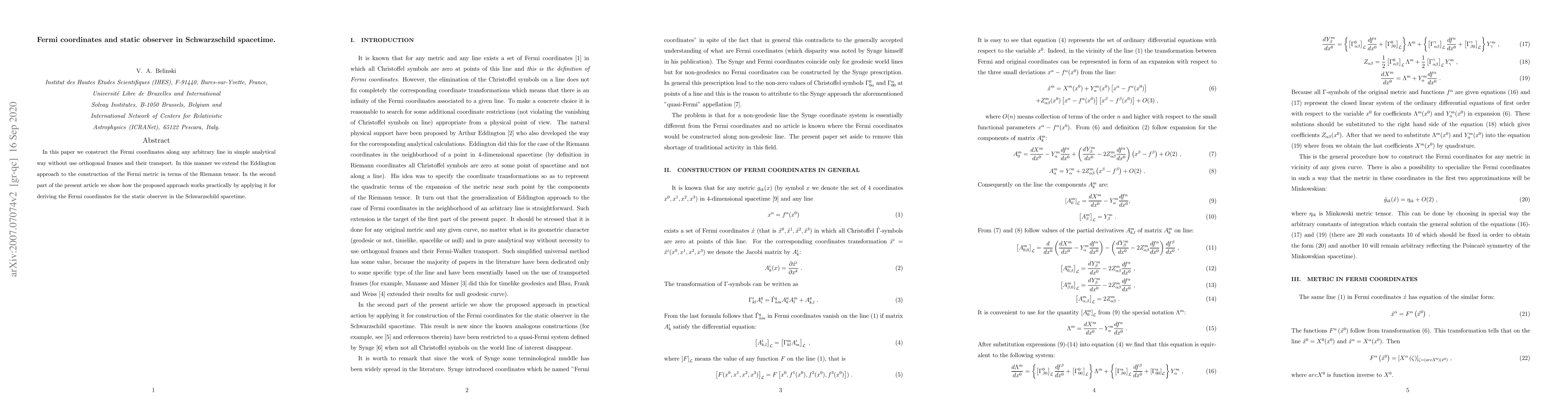 In this paper we construct the Fermi coordinates along any arbitrary line in simple analytical way without use the orthogonal frames and their parallel transport. In this manner we extend the Eddington approach to the construction of the Fermi metric in terms of the Riemann tensor. In the second part of the present article we show how the proposed approach works practically by applying it for deriving the Fermi coordinates for the static observer in the Schwarzschild spacetime.