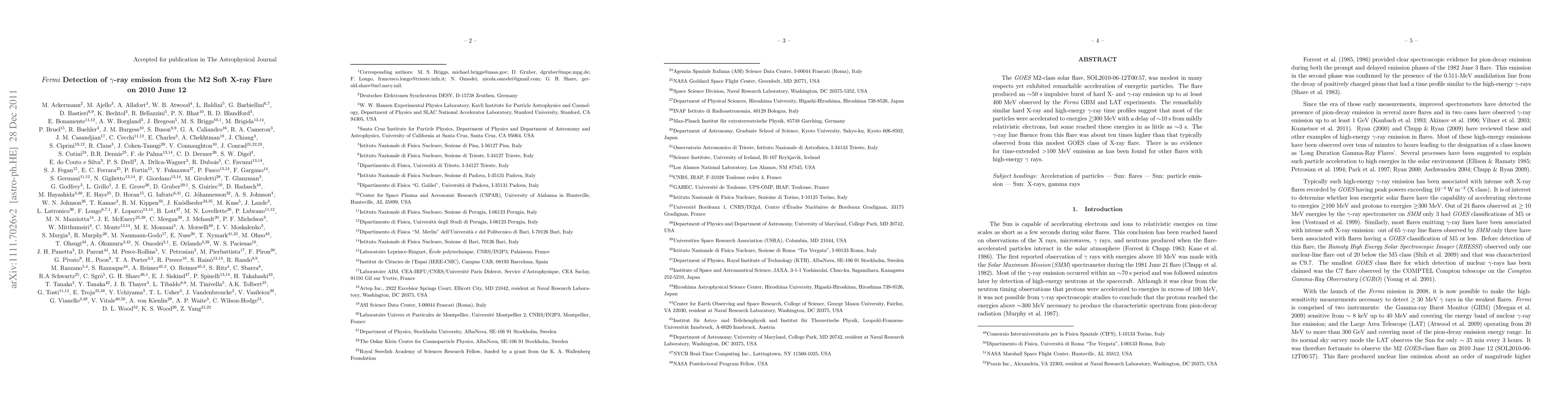 The GOES M2-class solar flare, SOL2010-06-12T00:57, was modest in many respects yet exhibited remarkable acceleration of energetic particles. The flare produced an ~50 s impulsive burst of hard X- and \gamma-ray emission up to at least 400 MeV observed by the Fermi GBM and LAT experiments. The remarkably similar hard X-ray and high-energy \gamma-ray time profiles suggest that most of the particles were accelerated to energies >300 MeV with a delay of ~10 s from mildly relativistic electrons, but some reached these energies in as little as ~3 s. The \gamma-ray line fluence from this flare was about ten times higher than that typically observed from this modest GOES class of X-ray flare. There is no evidence for time-extended >100 MeV emission as has been found for other flares with high-energy \gamma rays.