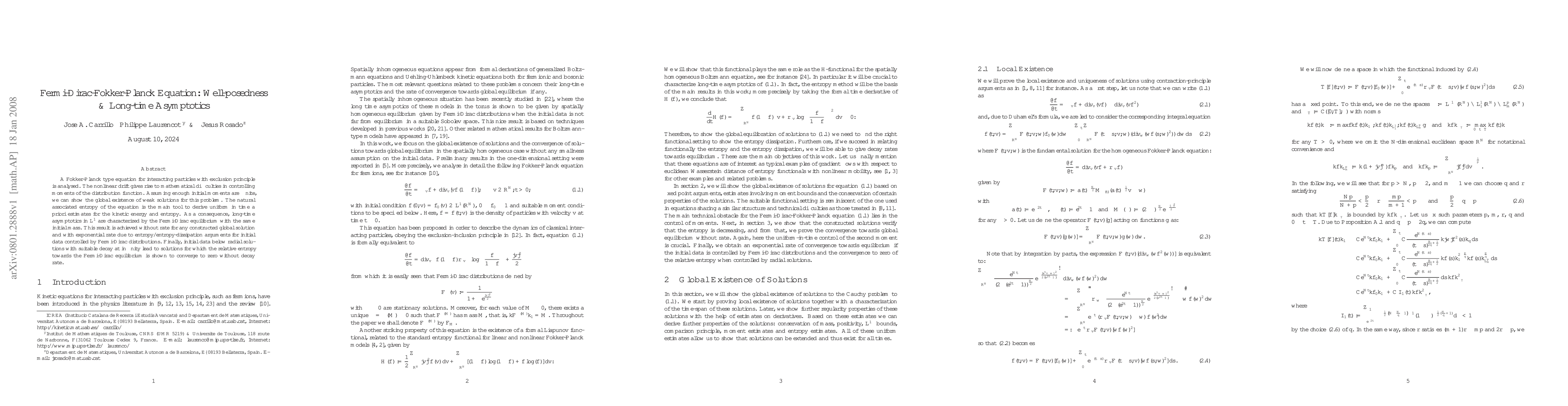 A Fokker-Planck type equation for interacting particles with exclusion principle is analysed. The nonlinear drift gives rise to mathematical difficulties in controlling moments of the distribution function. Assuming enough initial moments are finite, we can show the global existence of weak solutions for this problem. The natural associated entropy of the equation is the main tool to derive uniform in time a priori estimates for the kinetic energy and entropy. As a consequence, long-time asymptotics in $L^1$ are characterized by the Fermi-Dirac equilibrium with the same initial mass. This result is achieved without rate for any constructed global solution and with exponential rate due to entropy/entropy-dissipation arguments for initial data controlled by Fermi-Dirac distributions. Finally, initial data below radial solutions with suitable decay at infinity lead to solutions for which the relative entropy towards the Fermi-Dirac equilibrium is shown to converge to zero without decay rate.