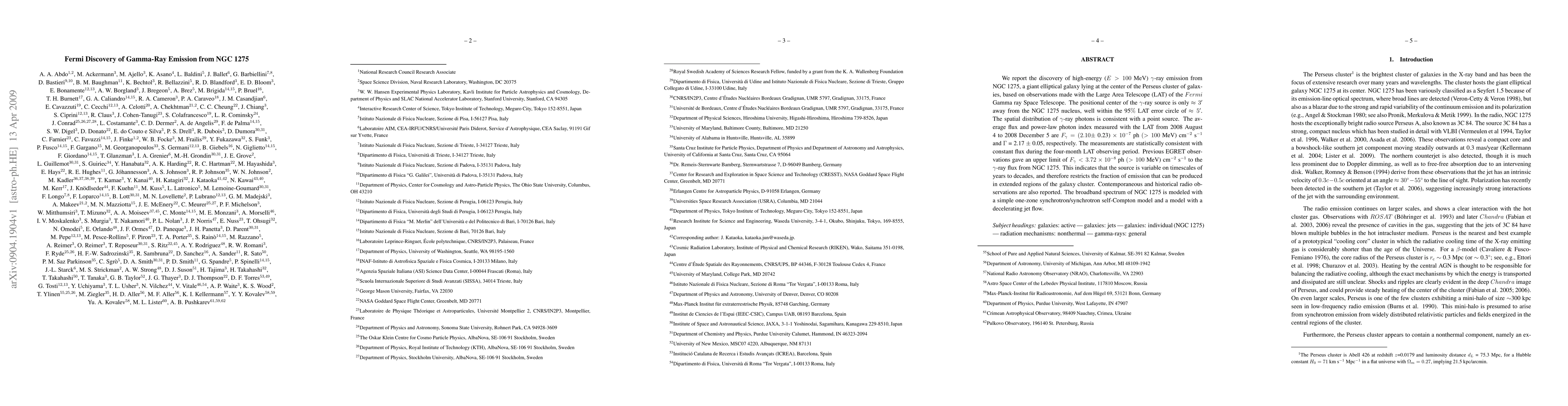 The Fermi Gamma-ray Space Telescope discovered high-energy gamma-ray emission from NGC 1275, a central elliptical galaxy in the Perseus cluster, indicating variability on timescales of years to decades. The gamma-ray source is consistent with a point source near the galaxy's nucleus, suggesting restricted emission from extended regions.