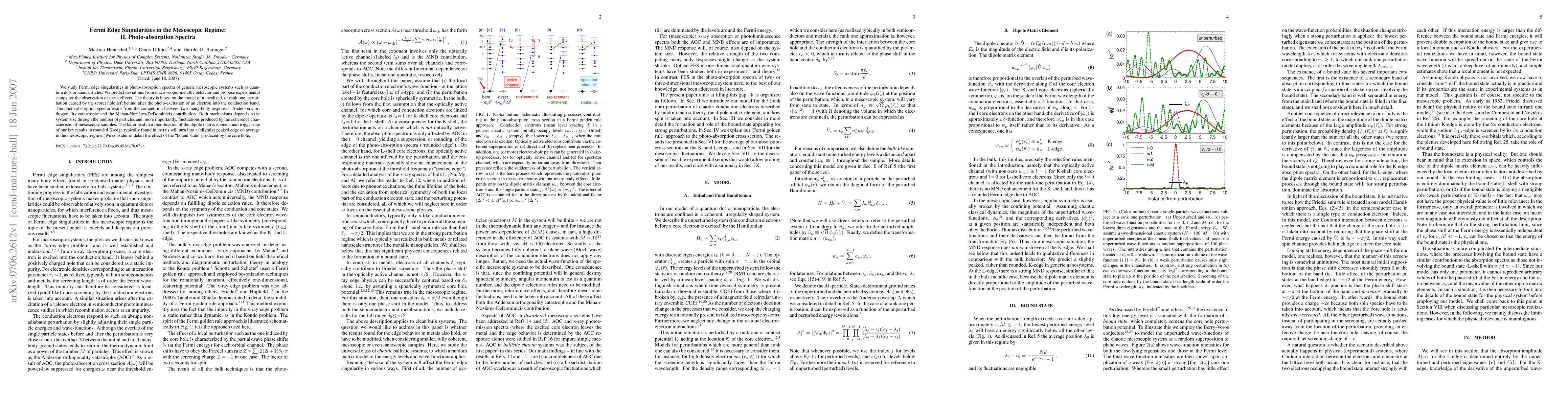 We study Fermi edge singularities in photo-absorption spectra of generic mesoscopic systems such as quantum dots or nanoparticles. We predict deviations from macroscopic-metallic behavior and propose experimental setups for the observation of these effects. The theory is based on the model of a localized, or rank one, perturbation caused by the (core) hole left behind after the photo-excitation of an electron into the conduction band. The photo-absorption spectra result from the competition between two many-body responses, Anderson's orthogonality catastrophe and the Mahan-Nozieres-DeDominicis contribution. Both mechanisms depend on the system size through the number of particles and, more importantly, fluctuations produced by the coherence characteristic of mesoscopic samples. The latter lead to a modification of the dipole matrix element and trigger one of our key results: a rounded K-edge typically found in metals will turn into a (slightly) peaked edge on average in the mesoscopic regime. We consider in detail the effect of the "bound state" produced by the core hole.