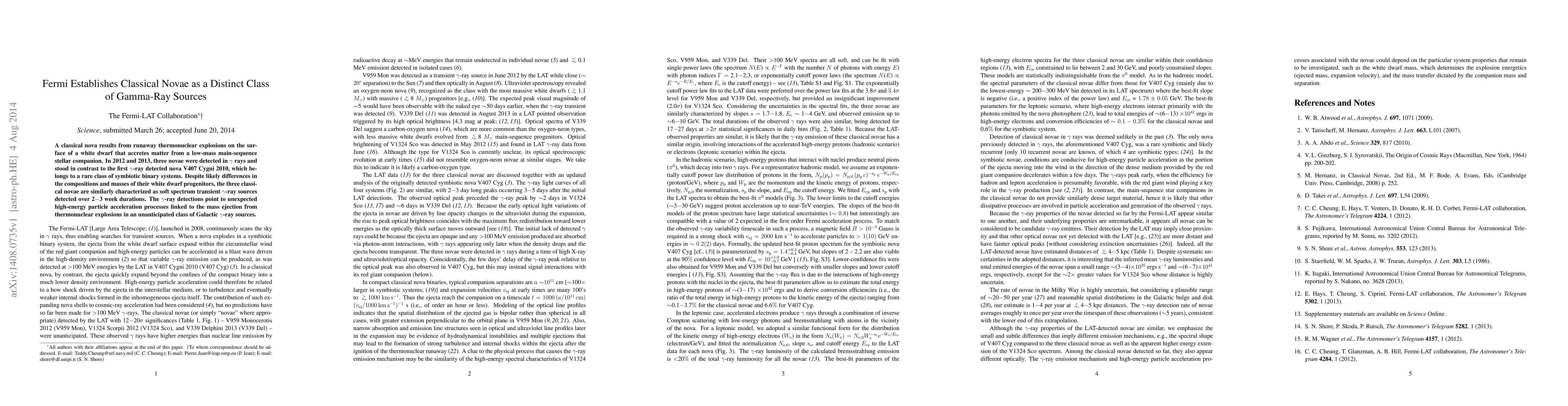 Fermi identifies three classical novae as distinct gamma-ray sources, contrasting with the rare symbiotic binary system nova V407 Cygni. These novae exhibit similar transient gamma-ray emissions, indicating unexpected high-energy particle acceleration linked to thermonuclear explosions.