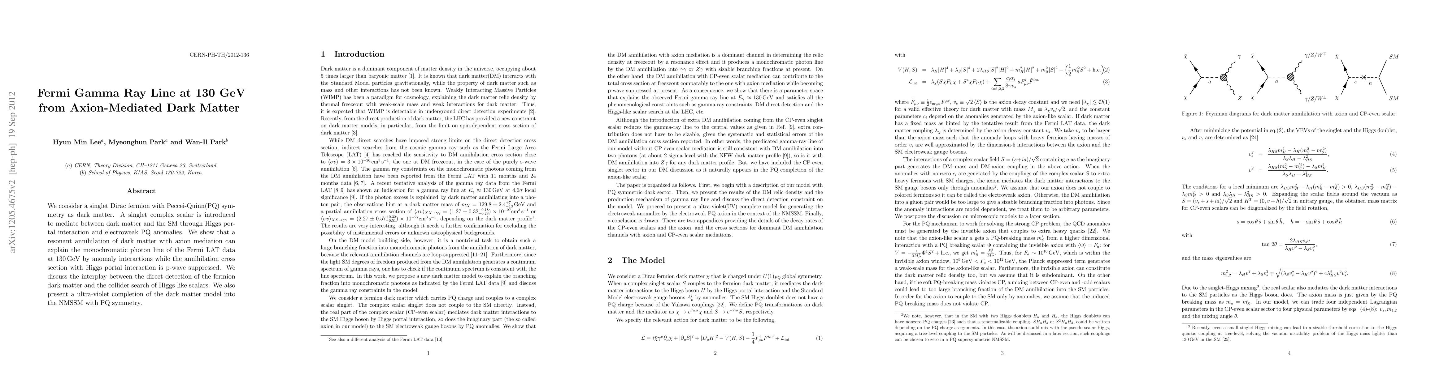 We consider a singlet Dirac fermion with Peccei-Quinn(PQ) symmetry as dark matter. A singlet complex scalar is introduced to mediate between dark matter and the SM through Higgs portal interaction and electroweak PQ anomalies. We show that a resonant annihilation of dark matter with axion mediation can explain the monochromatic photon line of the Fermi LAT data at 130 GeV by anomaly interactions while the annihilation cross section with Higgs portal interaction is p-wave suppressed. We discuss the interplay between the direct detection of the fermion dark matter and the collider search of Higgs-like scalars. We also present a ultra-violet completion of the dark matter model into the NMSSM with PQ symmetry.