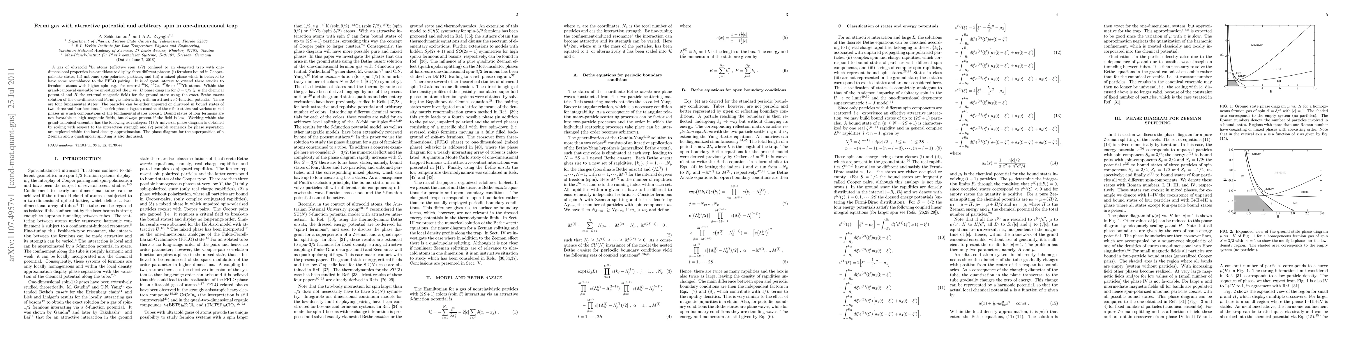 A gas of ultracold $^6$Li atoms (effective spin 1/2) confined to an elongated trap with one-dimensional properties is a candidate to display three different phases: (i) fermions bound in Cooper-pair-like states, (ii) unbound spin-polarized particles, and (iii) a mixed phase which is believed to have some resemblance to the FFLO pairing. It is of great interest to extend these studies to fermionic atoms with higher spin, e.g., for neutral $^{40}$K, $^{43}$Ca, $^{87}$Sr or $^{173}$Yb atoms. Within the grand-canonical ensemble we investigated the $\mu$ vs. $H$ phase diagram for $S=3/2$ ($\mu$ is the chemical potential and $H$ the external magnetic field) for the ground state using the exact Bethe {\it ansatz} solution of the one-dimensional Fermi gas interacting with an attractive $\delta$-function potential. There are four fundamental states: The particles can be either unpaired or clustered in bound states of two, three and four fermions. The rich phase diagram consists of these four states and various mixed phases in which combinations of the fundamental states coexist. Bound states of four fermions are not favorable in high magnetic fields, but always present if the field is low. Working within the grand-canonical ensemble has the following advantages: (1) A universal phase diagram is obtained by scaling with respect to the interaction strength and (2) possible scenarios for phase separation are explored within the local density approximation. The phase diagram for the superposition of a Zeeman and a quadrupolar splitting is also discussed.