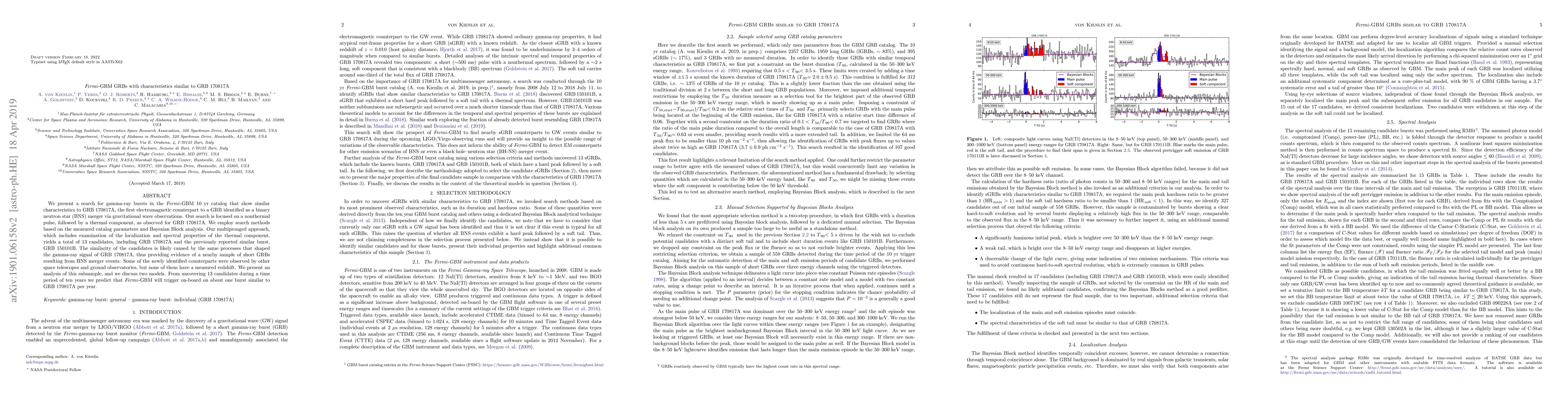 This study identifies 13 gamma-ray burst (GRB) candidates in the Fermi-GBM catalog that resemble GRB 170817A, the first GRB linked to a binary neutron star merger. The search focuses on non-thermal followed by thermal components, revealing a sample of short GRBs likely from BNS mergers. The findings suggest Fermi-GBM will detect about one similar GRB per year.