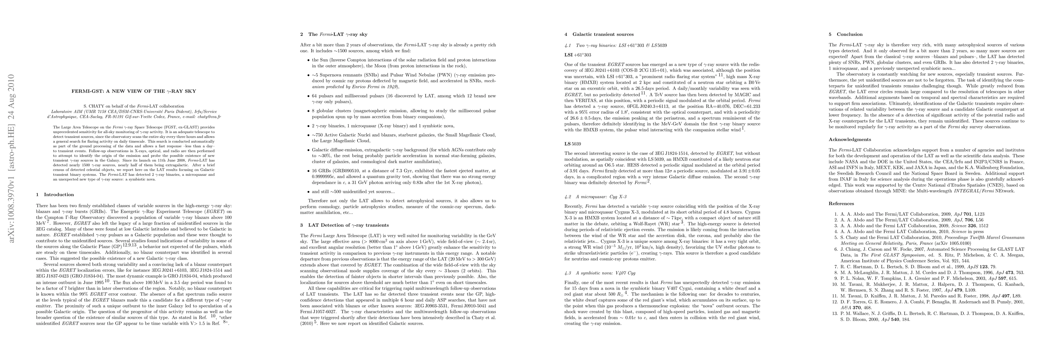 The Large Area Telescope on the Fermi gamma-ray Space Telescope (FGST, ex-GLAST) provides unprecedented sensitivity for all-sky monitoring of gamma-ray activity. It is an adequate telescope to detect transient sources, since the observatory scans the entire sky every three hours and allows a general search for flaring activity on daily timescale. This search is conducted automatically as part of the ground processing of the data and allows a fast response -less than a day- to transient events. Follow-up observations in X-rays, optical, and radio are then performed to attempt to identify the origin of the emission and probe the possible existence of new transient gamma-ray sources in the Galaxy. Since its launch on 11th June 2008, Fermi-LAT has detected nearly 1500 gamma-ray sources, nearly half of them being extragalactic. After a brief census of detected celestial objects, we report here on the LAT results focusing on Galactic transient binary systems. The Fermi-LAT has detected 2 gamma-ray binaries, a microquasar and an unexpected new type of gamma-ray source: a symbiotic nova.