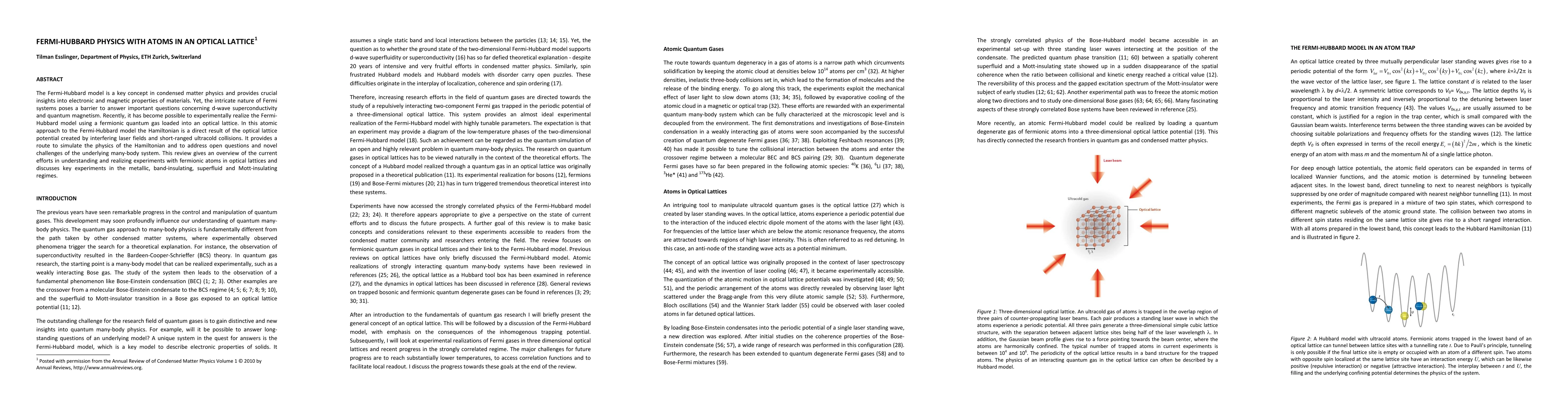 This paper reviews recent advancements in experimentally realizing the Fermi-Hubbard model using fermionic atoms in optical lattices, providing insights into electronic and magnetic properties of materials, and addressing questions about d-wave superconductivity and quantum magnetism across various regimes.