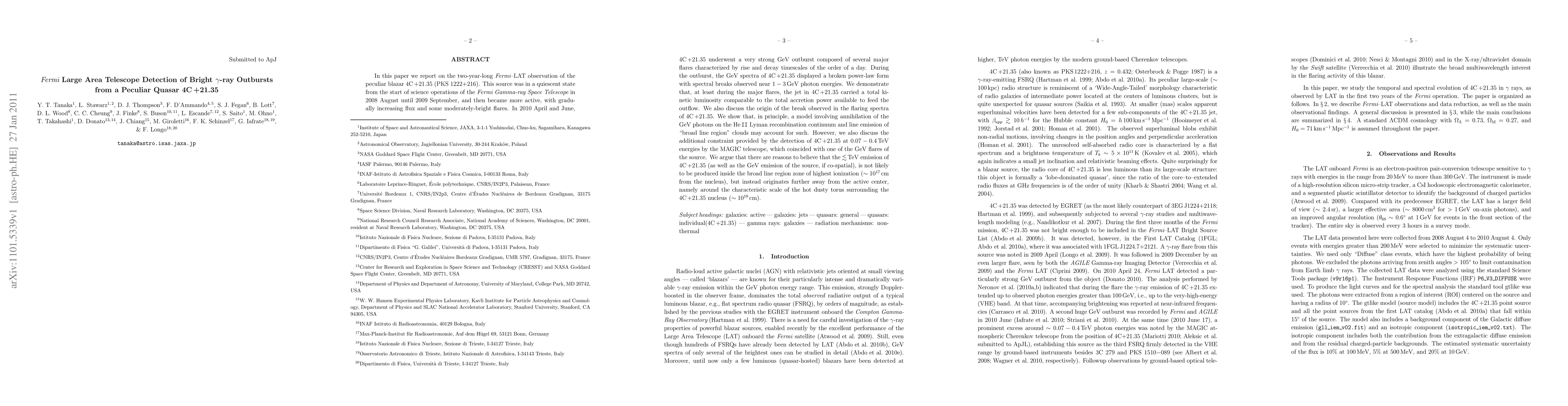 The Fermi Large Area Telescope detected significant GeV gamma-ray outbursts from the peculiar quasar 4C +21.35, revealing strong flares in 2010 with broken power-law spectra. The study suggests the jet's kinetic luminosity during flares matches the accretion power, and the TeV emission likely originates from the hot dusty torus surrounding the quasar's nucleus rather than the broad line region.