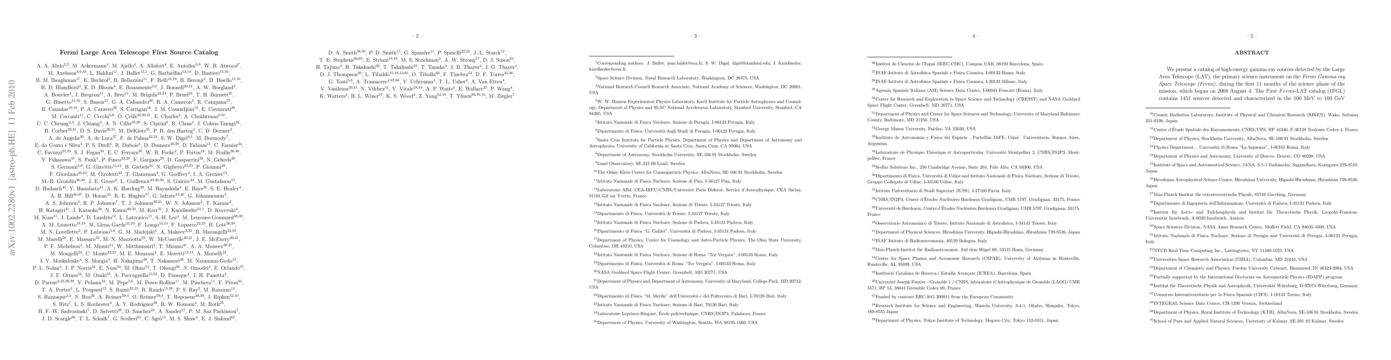 The Fermi Large Area Telescope (LAT) has released its First Source Catalog (1FGL) containing 1451 high-energy gamma-ray sources detected over 100 MeV to 100 GeV during the first 11 months of the Fermi mission. The catalog includes detailed spectral and variability data, with 630 sources remaining unassociated.