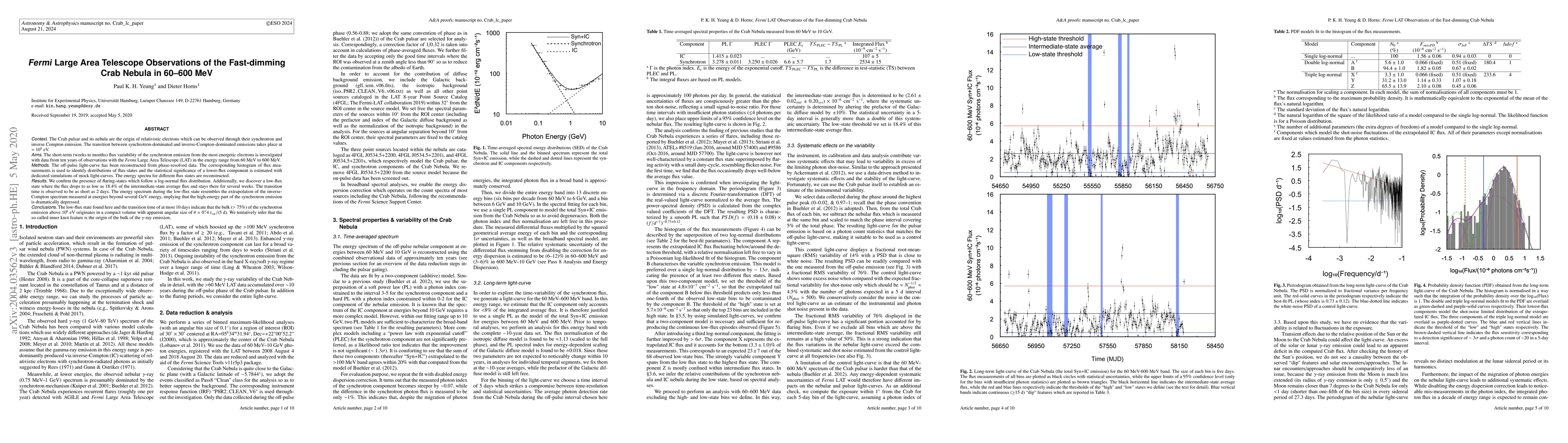 Context: The Crab pulsar and its nebula are the origin of relativistic electrons which can be observed through their synchrotron and inverse Compton emission. The transition between synchrotron-dominated and inverse-Compton-dominated emissions takes place at $\approx 10^9$ eV. Aims: The short-term (weeks to months) flux variability of the synchrotron emission from the most energetic electrons is investigated with data from ten years of observations with the Fermi Large Area Telescope (LAT) in the energy range from 60 MeV to 600 MeV. Methods: The off-pulse light-curve has been reconstructed from phase-resolved data. The corresponding histogram of flux measurements is used to identify distributions of flux-states and the statistical significance of a lower-flux component is estimated with dedicated simulations of mock light-curves. The energy spectra for different flux states are reconstructed. Results: We confirm the presence of flaring-states which follow a log-normal flux distribution. Additionally, we discover a low-flux state where the flux drops to as low as 18.4% of the intermediate-state average flux and stays there for several weeks. The transition time is observed to be as short as 2 days. The energy spectrum during the low-flux state resembles the extrapolation of the inverse-Compton spectrum measured at energies beyond several GeV energy, implying that the high-energy part of the synchrotron emission is dramatically depressed. Conclusions: The low-flux state found here and the transition time of at most 10 days indicate that the bulk ($>75$%) of the synchrotron emission above $10^8$ eV originates in a compact volume with apparent angular size of $\theta\approx0.4" t_\mathrm{var}/(5 \mathrm{d})$. We tentatively infer that the so-called inner knot feature is the origin of the bulk of the $\gamma$-ray emission.