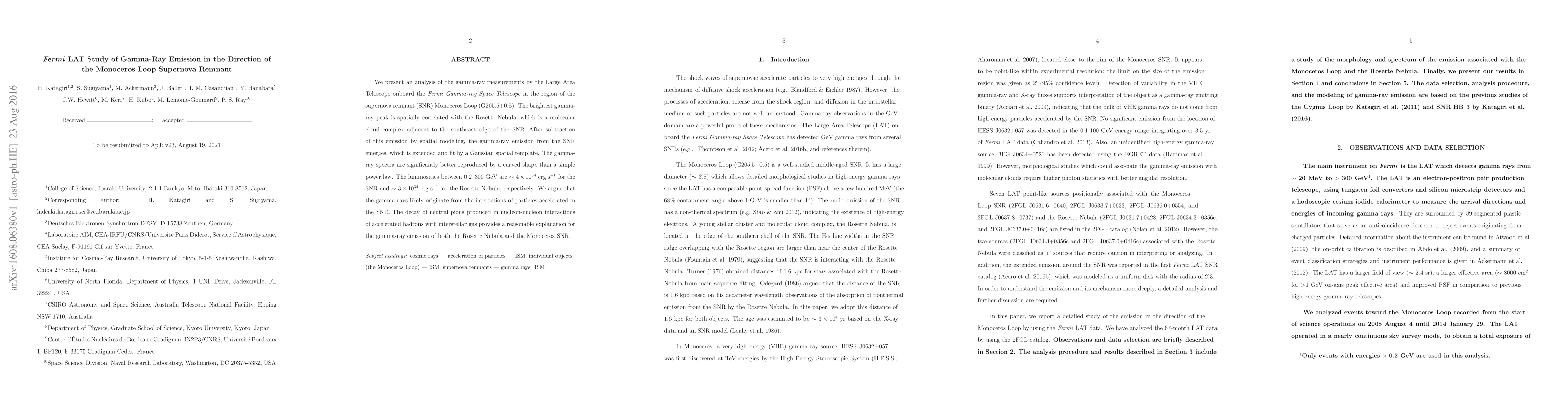 This study analyzes gamma-ray data from the Fermi Large Area Telescope, revealing that the Monoceros Loop supernova remnant emits gamma rays likely from particle interactions. The gamma-ray emission from the Rosette Nebula, a nearby molecular cloud, is distinguished and attributed to nucleon-nucleon interactions.