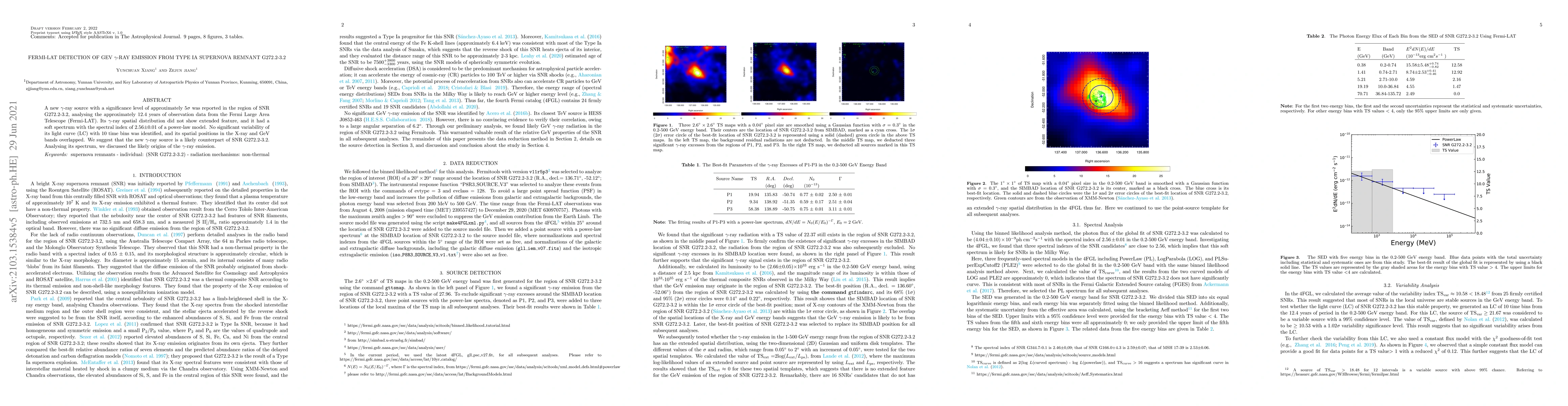 The Fermi-LAT detected a new GeV gamma-ray source with a 5$\sigma$ significance in the region of Type Ia supernova remnant G272.2-3.2, showing a soft spectrum and no significant variability. The source likely corresponds to the supernova remnant based on spatial and spectral analysis.