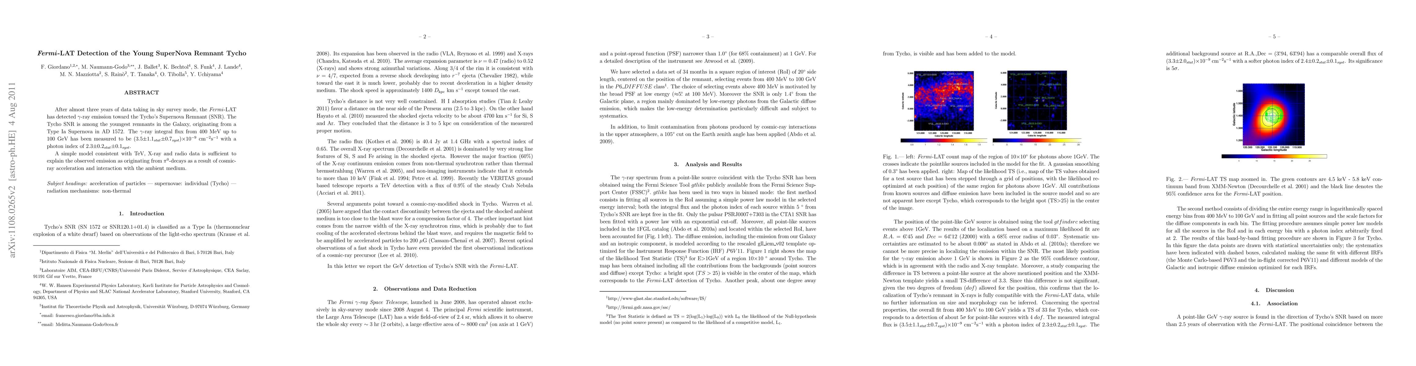 The Fermi-LAT detected $\gamma$-ray emission from the young Tycho Supernova Remnant, originating from a Type Ia Supernova in AD 1572, with a measured flux of (3.5$\pm1.1_{stat}\pm0.7_{syst}$)$\times10^{-9}$ cm$^{-2}$s$^{-1}$ and a photon index of 2.3$\pm0.2_{stat}\pm0.1_{syst}$. This observation provides insights into the remnant's high-energy processes.