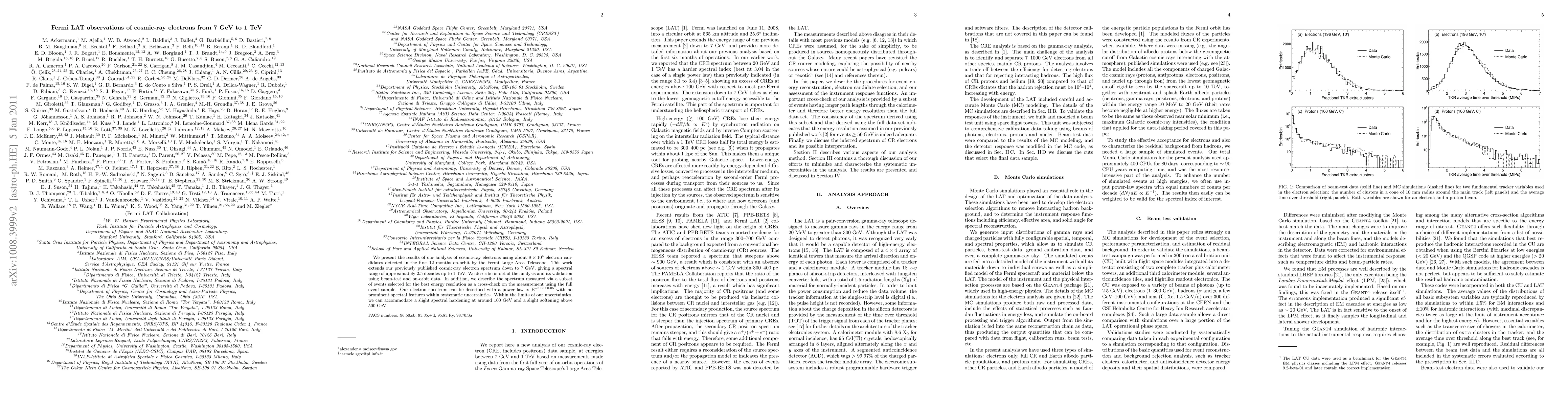 The Fermi LAT telescope detected 8 million cosmic-ray electrons from 7 GeV to 1 TeV, revealing a power-law spectrum with no prominent features. The data show slight spectral hardening at around 100 GeV and softening above 500 GeV.