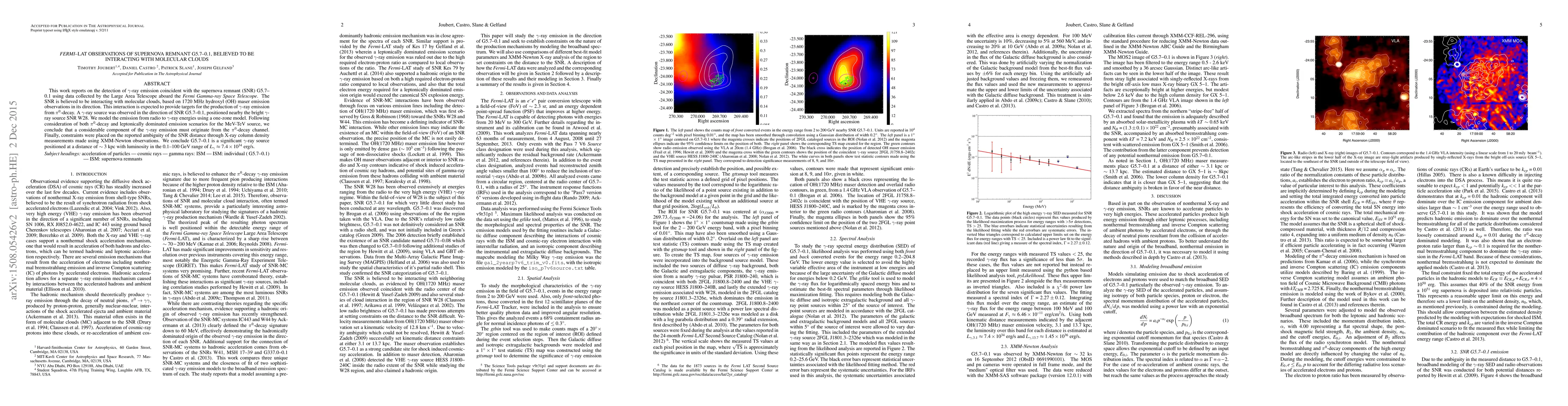 The Fermi-LAT detected $gamma$-ray emission from SNR G5.7-0.1, an interacting supernova remnant with molecular clouds. Using one-zone model, the study concludes that $pi^0$-decay significantly contributes to the $gamma$-ray emission, with the SNR positioned at ~3 kpc and a luminosity of $7.4 imes 10^{34}$ erg/s in the 0.1--100 GeV range.