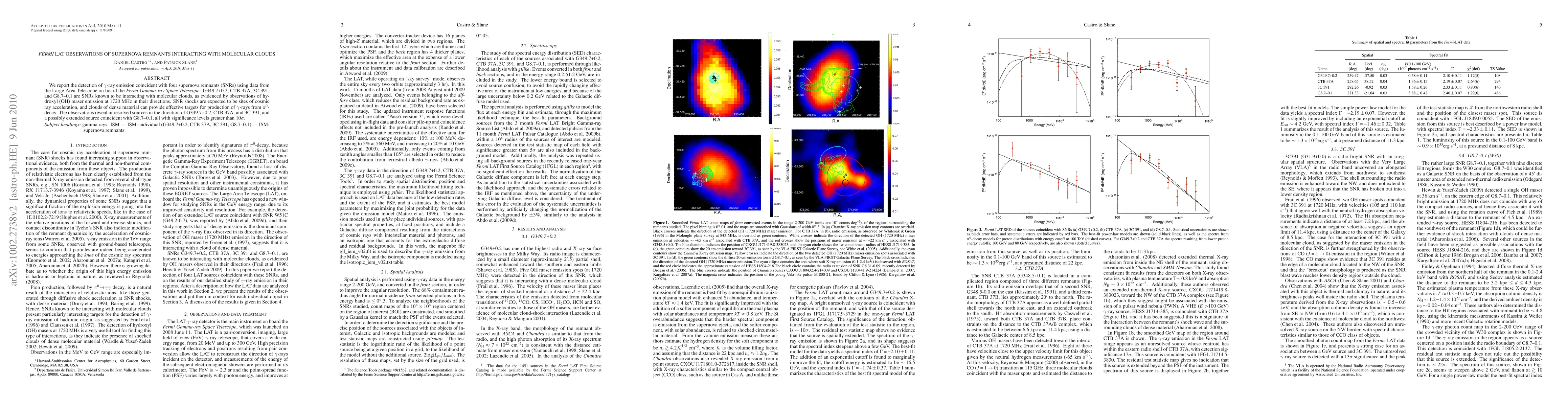 This paper reports the detection of gamma-ray emissions from four supernova remnants (SNRs) interacting with molecular clouds using Fermi LAT data. The findings suggest that SNR shocks accelerate cosmic rays, which produce gamma-rays when interacting with dense material.
